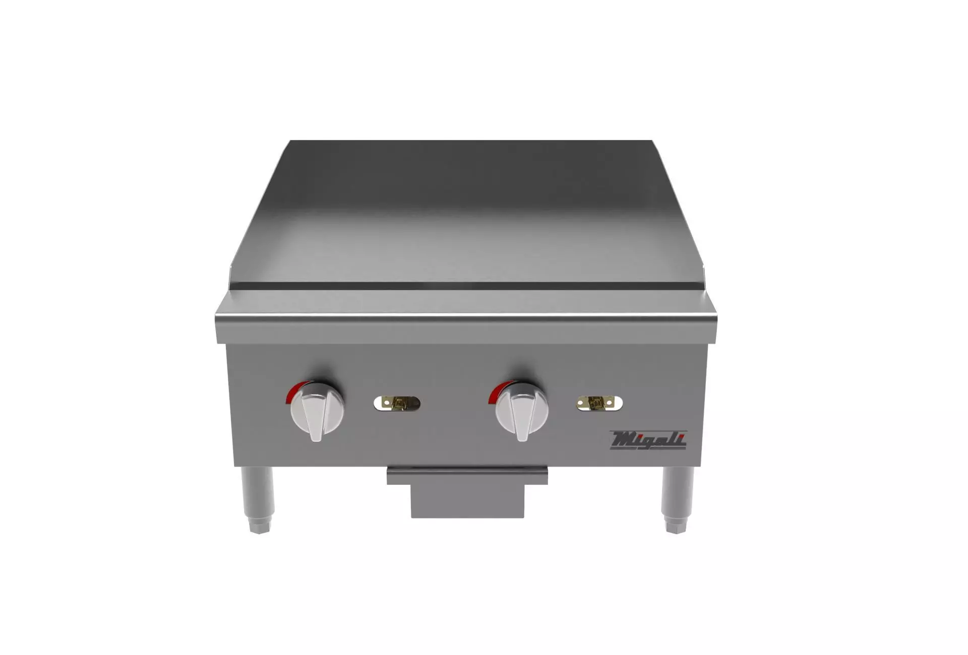 The Migali C-G24 24″ wide, manual griddle is essential to most commercial kitchens and restaurants. This model is designed with a 20″ deep, 3/4″ thick steel cooking surface and includes (2) chrome temperature knobs. Migali “U” shape burners are robust, creating an even temperature across the cooking surface. Finally, the C-G24 is also eye catching, boasting a high polished stainless steel exterior and interior, chrome accents and stainless steel adjustable legs.UPC 819296020612Exterior Width 24Exterior Depth 28.6Exterior Height 15.2Weight 160 lbsShipping Width 26.8Shipping Depth 31.1Shipping Height 18.2Shipping Weight 195 lbsNumber of Burners 2Total BTU 60000Power Type Natural Gas / Liquid PropaneBurner Style “U” shapeControl Type ManualCooking Surface Material 3/4″ SteelIgnition ManualValve Type Pilot LightBurner BTU 30000Working Area 23.9″ w x 19.9″ d x 3/4″ highIntake-tube Pressure (W.C.) Natural Gas 4Intake-tube Pressure (W.C.) LP 10Nozzle Number Natural Gas #37Nozzle NumberLP #51Gas Inlet Size 3/4″Number of Controls 2Temperature Range 200° F to 575° F