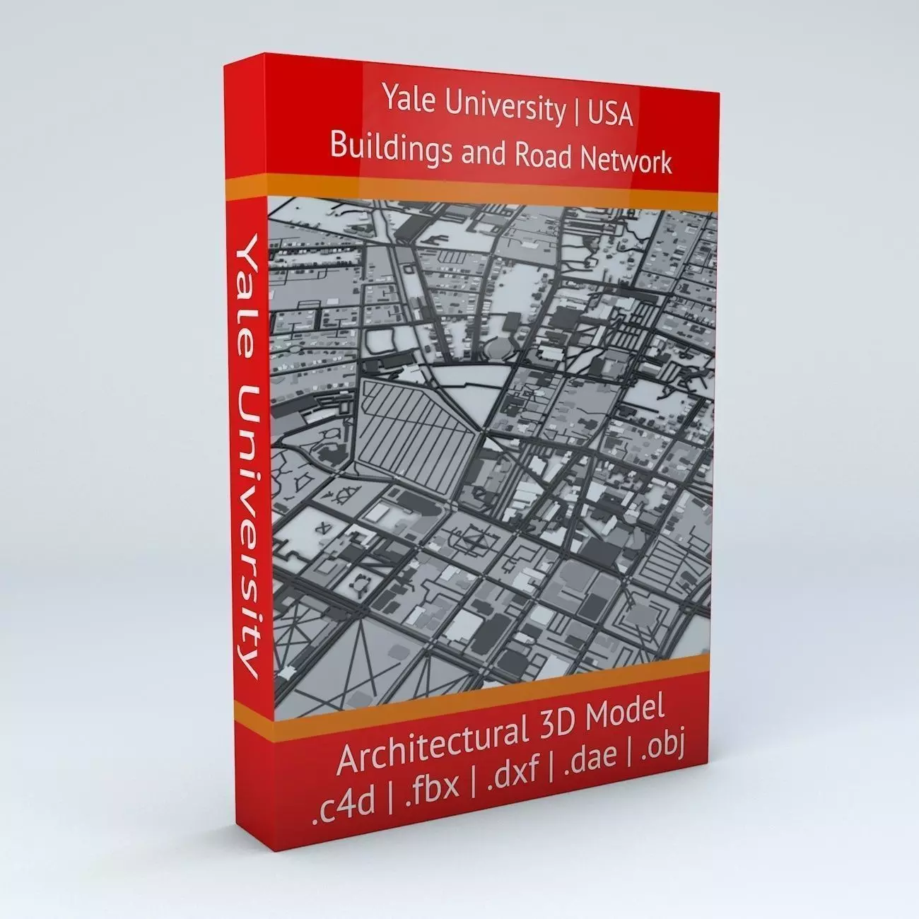 - this model is based on real data therefore this is a realistic road network and streets setup of Yale University in New Haven, USA- 3 building groups are setup so that you can add variety to buildings (color materials and/or textures) Groups can be turned off/on- 2 objects included for the Road Network | 1. roads and streets 2. squares and plazas- the buildings and road network match by default (no extra setup steps needed to fit them)- UV mapped with overlapping UVs- the model is positioned on a flat surface (road network is on the “floor” - no elevation data included)- geometry is polygonal quads and tris- model is untextured and renders fast