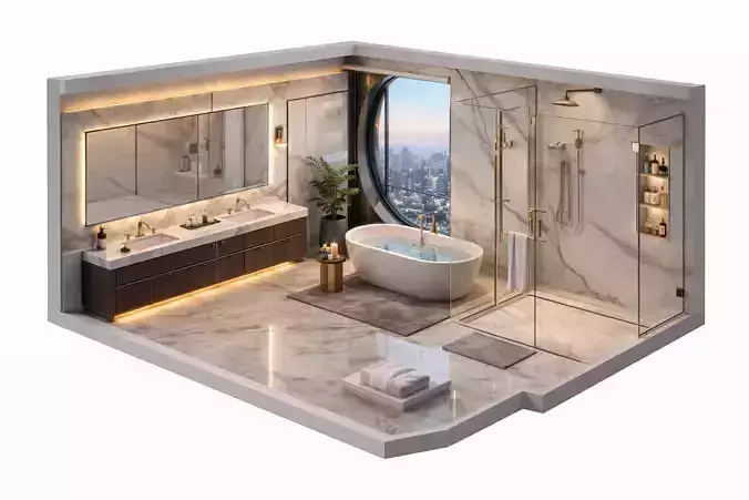 Este modelo 3D representa un baño moderno y elegante, diseñado para visualización arquitectónica, renders interiores y presentaciones inmobiliarias con un alto nivel de realismo.