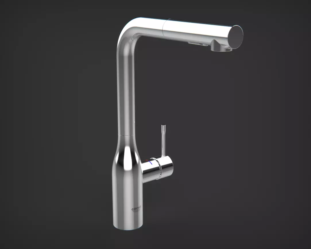 This is a model of the Grohe Essence single-lever kitchen mixer tap. Dimensions and geometry are based on measurements from the real product. Textures are including for the logo and the hot/cold indicators.