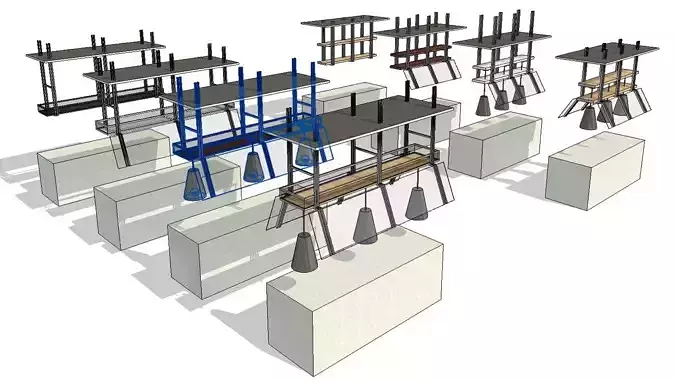 This product includes two different types of unique fully parametric ceiling based generic models families for a buffet or countertop ceiling hanging decorative shelves with sneeze guards and heating lamps. First model is with two overhang shelves and the second with one tray basket. The models are ideal for placing over restaurant buffet counters or even for private kitchen islands and counters.