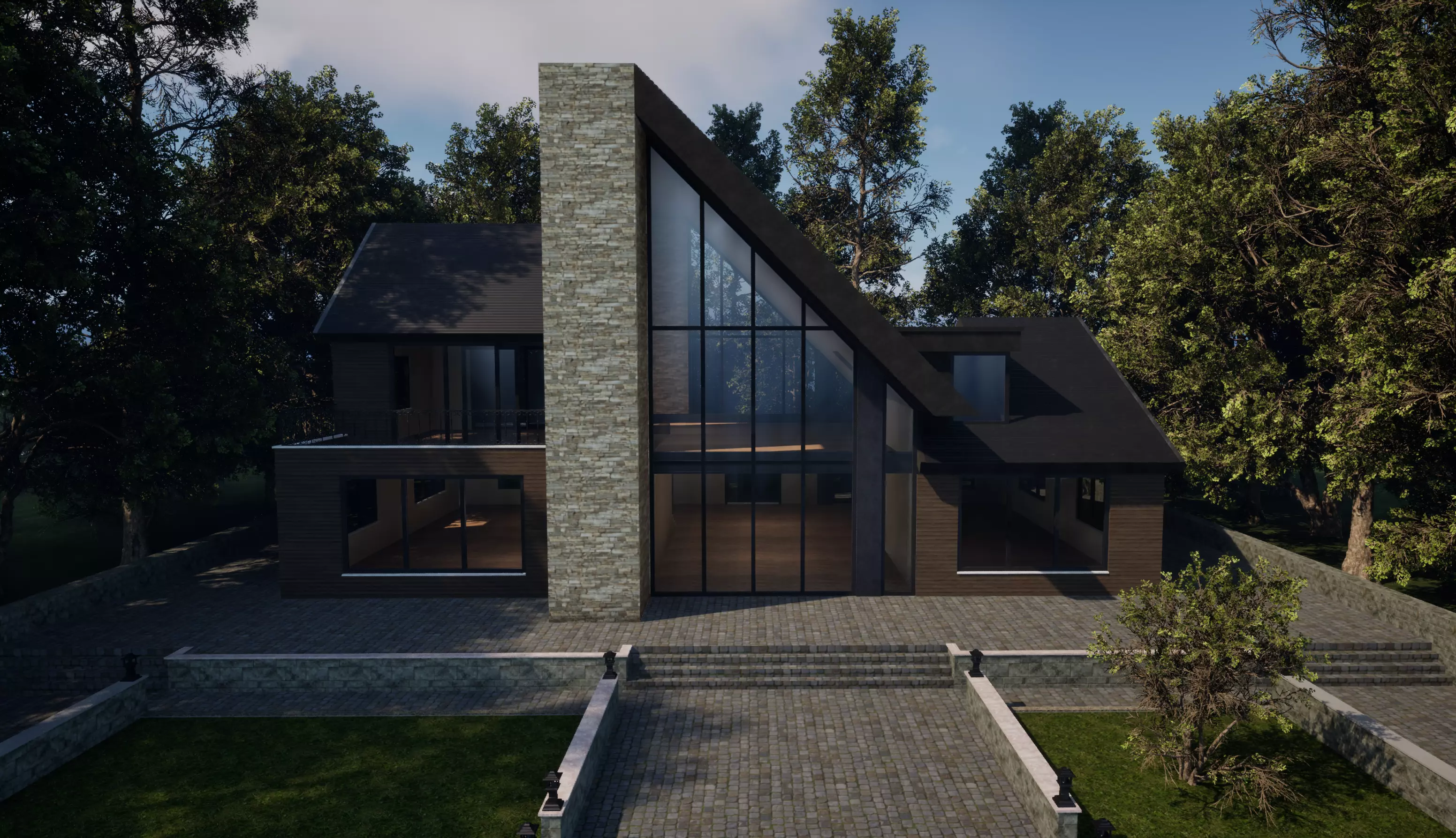 - Modern Architectural Style: Showcasing a luxury A-frame villa with a stunning glass wall façade, stone chimney, and sleek wooden paneling, ideal for high-end renders.