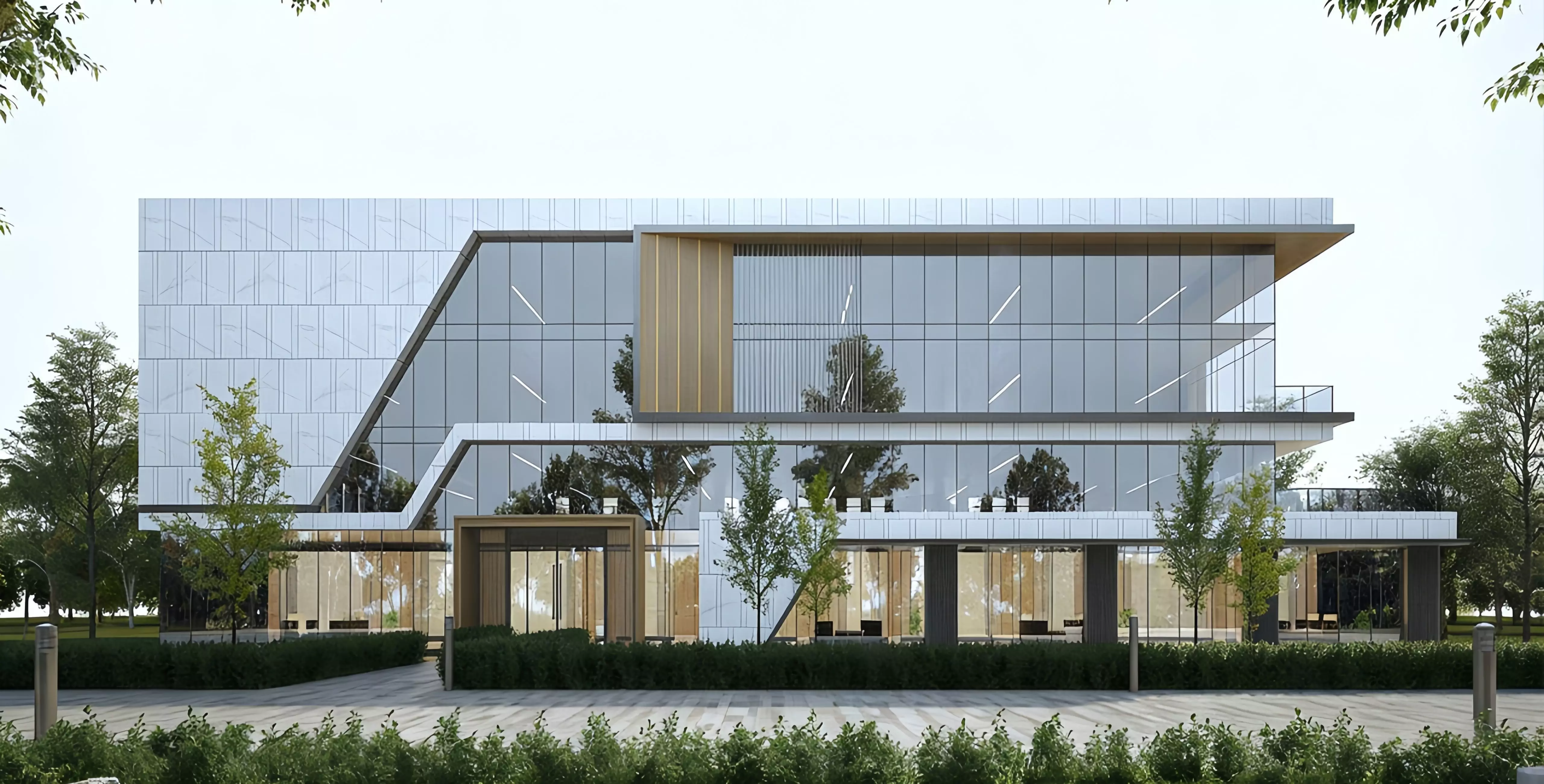 English TranslationThis is a multi-story office building featuring a modern minimalist style. Its facade is composed of large-area glass curtain walls spliced with light gray stone panels, accentuated by warm wood-toned metal trim, creating a crisp sense of geometric division. The overall structure of the building is transparent and lightweight, with the glass reflecting the surrounding lush trees and natural daylight. This design not only ensures ample natural lighting indoors but also enables the architecture to blend seamlessly with the surrounding green landscape. The ground floor adopts a transparent glass porch and open void design, paired with neatly arranged shrubs and street trees, fostering an open, comfortable, and high-quality entrance atmosphere for the office space. Ultimately, it presents an overall image of a high-end, eco-friendly, and modern office building.
