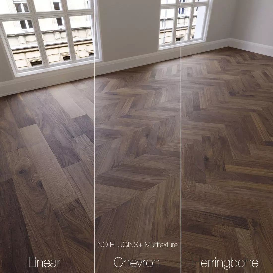 It consists of modules of approximately 10x10m, which can be docked indefinitely.The material of the parquet was created without the use of plug-ins (plus the material created with the help of Multi Texture map), includes 17 different planks with a resolution of 1800x300 pixels and maps bump and glossiness for them for linear parquet, and 30 different planks with a resolution of 900x150 pixels and bump maps and glossiness for them for chevron and herringbone.The archive consists of: max2012 + FBX + OBJ + MATLIB, preview.