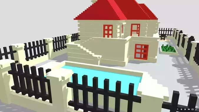 This 3D model showcases a stunning voxel-style villa, meticulously crafted with attention to detail. The villa boasts a unique architectural style with a blend of modern and traditional elements.
