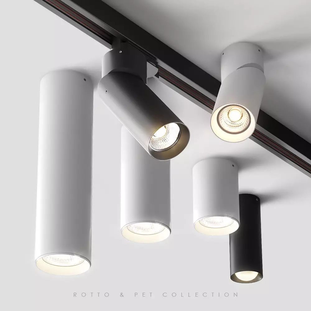 Model includes 4 configurations ROTTO spotlight and track light versions, 16 configurations of PET ceiling lights and essential units to design your own track layout - surface or suspended.
