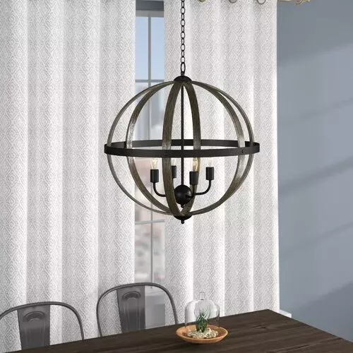 • As much a work of art as a lighting fixture, chandeliers elevate the look of any space. Plus, they spare your drywall, both from cutting new holes and patching old ones. Take this eye-catching piece for example: Blending a modern silhouette with the rustic appeal of industrial design, it showcases an openwork globe-inspired frame made from metal and wood awash in a neutral two-tone finish.