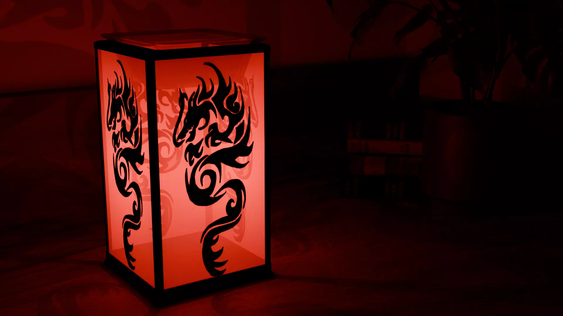 A dragon-themed wax warmer with a distinctive black metal frame and four semi-transparent milk glass shades featuring detailed dragon motifs. At the center, a red light source glows through the frosted glass, casting a warm, fiery ambiance in low light. The combination of dark metal and soft illuminated glass gives the piece a dramatic, mystical presence suited for fantasy or gothic-inspired interiors. The model is built with clean topology and realistic materials, including subtle translucency on the glass to simulate light passing through. Perfect for interior renders, fantasy scenes, or decorative asset collections.
