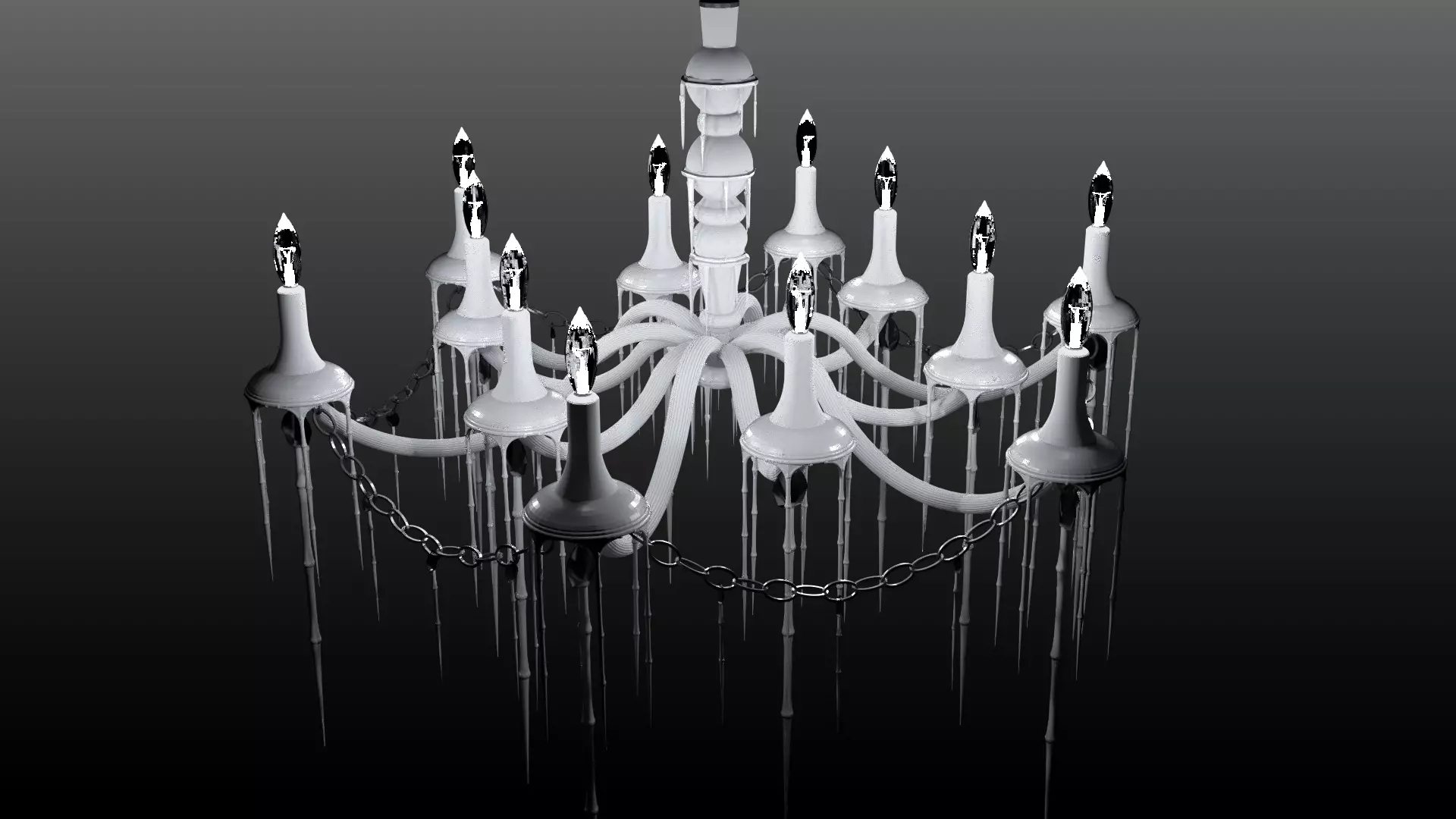 This chandelier was inspired by Piet Boon's Hot Kroon Chandelier. This is a contemporary chandelier that simulates melted wax over the 12 candles hosted by the centerpiece. The centerpiece also has the effect as well as an organic shape to create a pronouced and more dynamic model. The arms come in 2 sizes, a short and long arm, span from the lower end of the centerpiece. Each arm seats a candle base and candle with a bulb emulating the string top. Each candle base has a chain underneath the center hooked to a jem and wax drip element. Between each long arm dangles a metal chain.