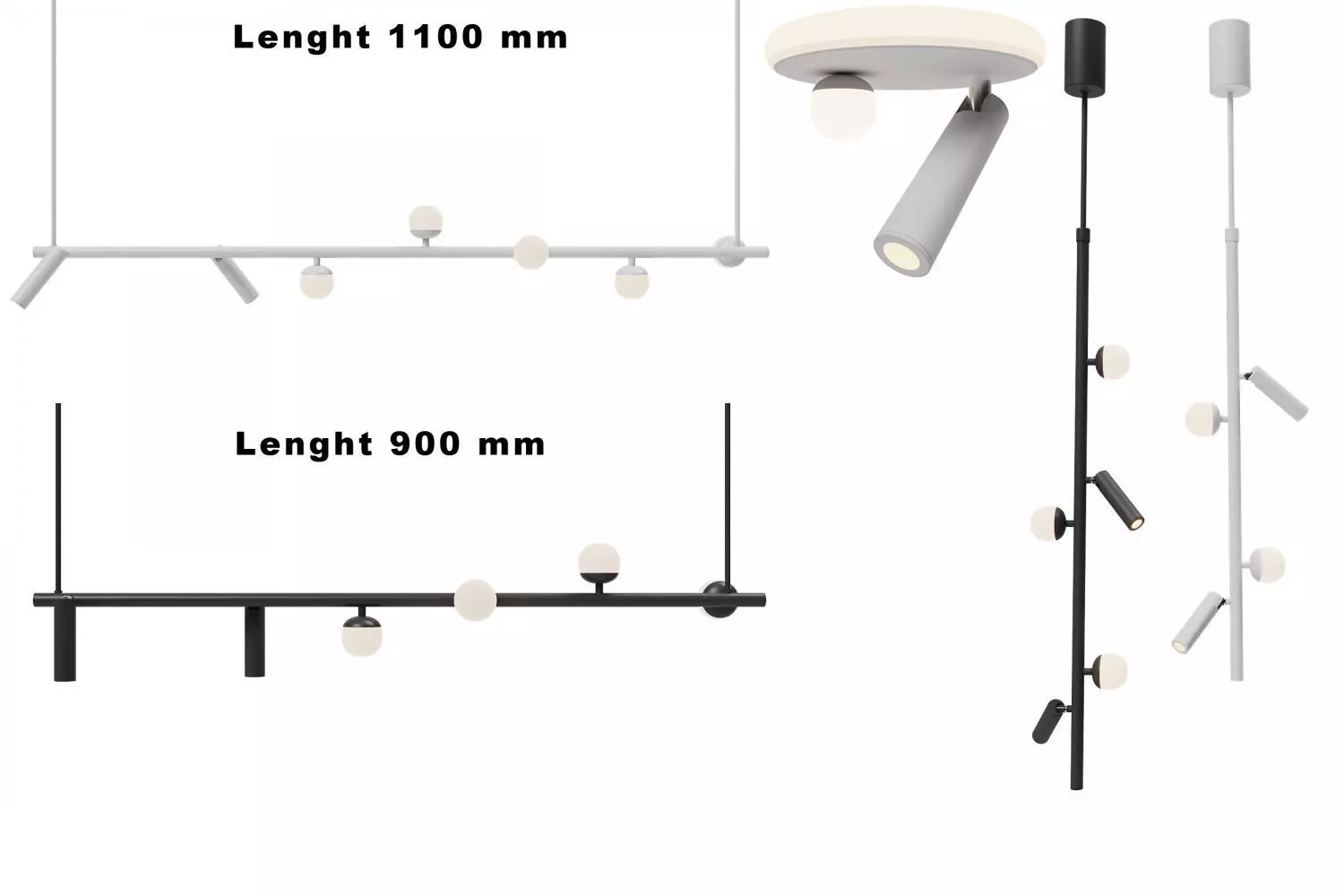 The model has a swivel luminaire binding for easy rotation and tilt.A series of pendant LED luminaires with ball and rotating cylindrical shades