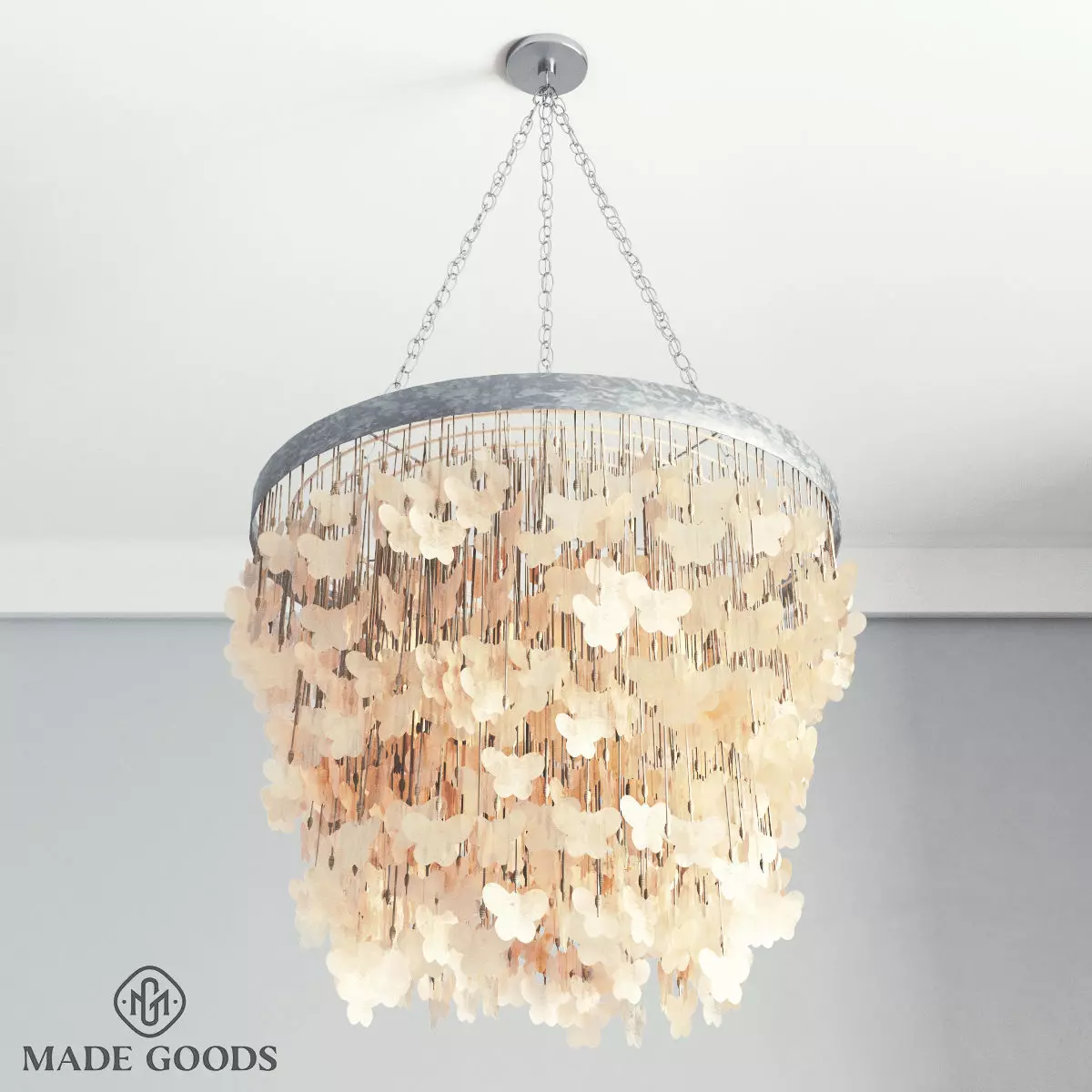 A flock of butterflies float and flutter. Over 100 coco beads drop fall from this beauty and each suspends one of two kinds of butterfly. The combination of luminous, reflective mother of pearl butterflies with soft translucent capiz butterflies adds to the beauty. Finished with antique gold metal detailing. A true room statement