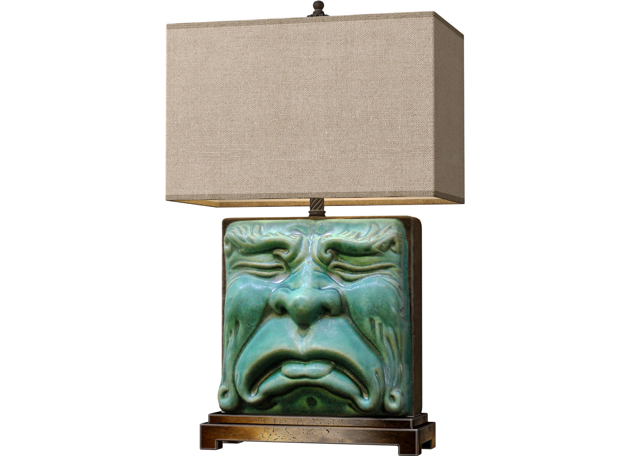 Decorative lamp with a base in the form of a comedy mask and a fabric shade for decorating the living room, office, study, bedroom, bedside table in a modern style.Ceramic Table Lamp Mask sculpture ,Western Lamps and Rustic Lighting,Desktop, designer, decorative, textured, embossed ,classic Modernist lampEuropean Art Nouveau Lamp for Home Decoration, Bedroom Lighting,