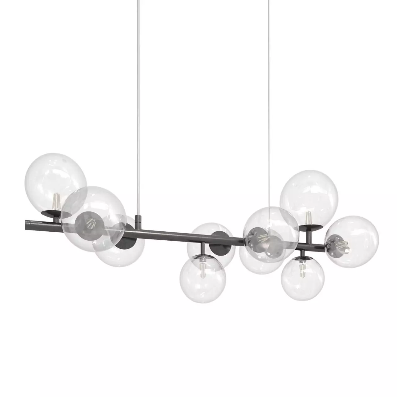 This modern and minimalist chandelier adds a touch of elegance and style to your interior. The design features multiple transparent glass globes and a sleek metal base, with each bulb thoughtfully positioned. The lightweight and transparent structure of the glass globes enhances the chandelier’s airy and minimalist appearance.
