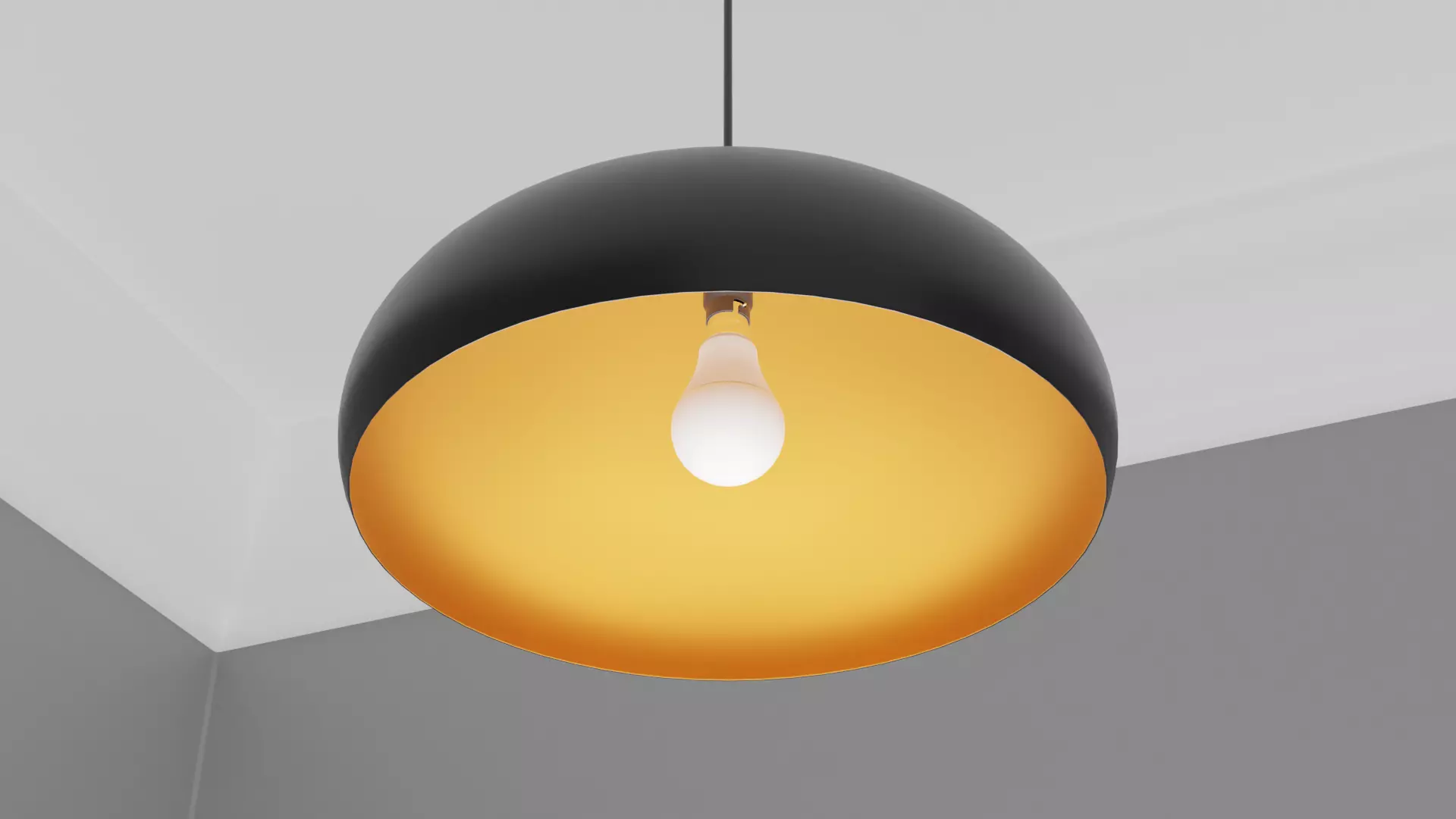 This pendant light is ideal for any Arch-Viz or game engine. It has a black matt finish with a gold metallic reflective material on the inside. It has one material for the light with non-overlapping UVs. Included is the bulb and bulb fitting. The Blender file has been packed and contains the materials and textures ready to use out of the box. It is modelled to scale: 1100mm X 400mm X 400mm Ceiling fitted with electrical wire. This model is based on a real model and will fit in any modern style setting.