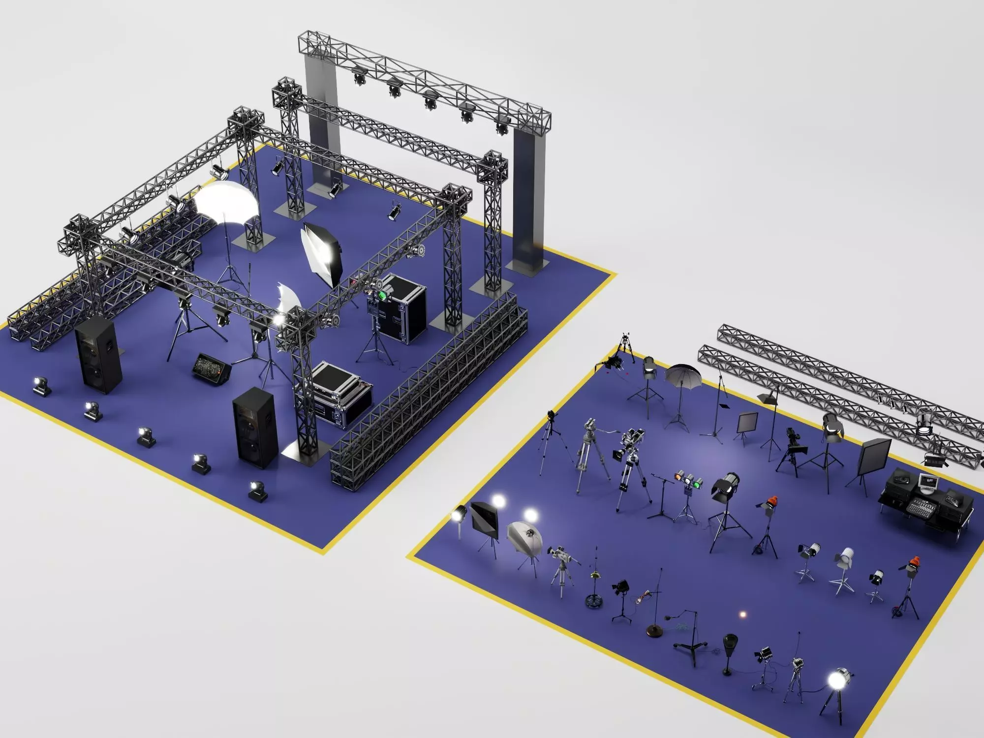 High-quality pack of professional photography studio and film lighting rig equipment 3D models, featuring: modular truss systems, LED spotlights/floodlights, softboxes, reflectors, C-stands, tripods, light stands, boom arms, sandbags, diffusion panels, speaker boxes, flight cases, backdrop supports, and detailed cinematic/photography studio props.Models built to real-world scale with high detail — realistic metal truss welds/reflections, fabric diffusion textures, rubber grip feet, cable management, subtle wear/scratches, emissive light glow, and authentic professional studio realism.Full PBR workflow with high-res textures (2K-4K): Albedo, Roughness, Metallic, Normal, AO maps for realistic metal shine, fabric softness, emissive lighting, surface variation, and depth in any lighting.Ideal for:• Architectural visualization and studio renders• Photography/film set, broadcast studio, and event space builds• Cinematic lighting rig and production simulation scenes• Game assets (Unity/Unreal ready)• VR/AR virtual production and studio tours• VFX, promotional videos, content creationOptimized polycount for real-time — drag and drop to enhance scenes instantly.Compatible formats:MAX (with materials), OBJ, FBXCompatible with 3ds Max, Maya, Blender, Cinema 4D, Unity, Unreal Engine, and more.