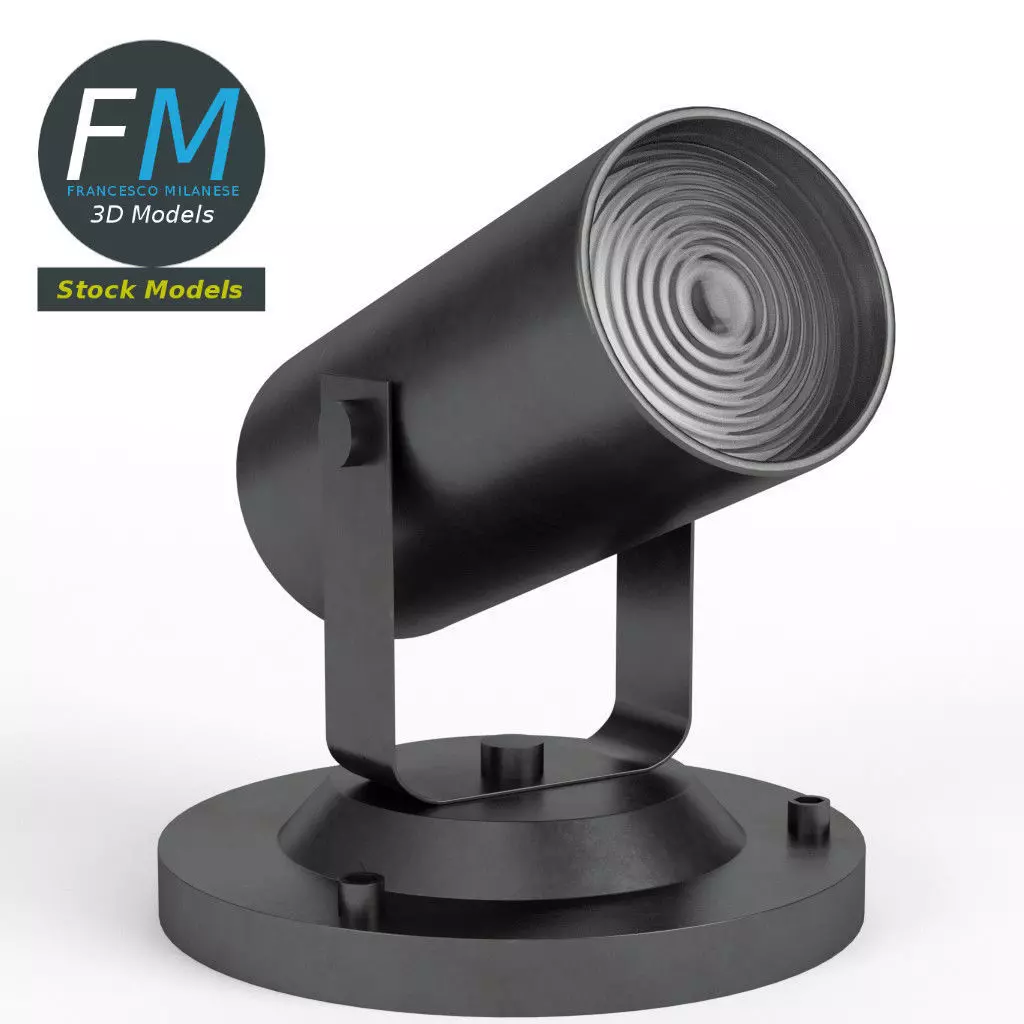 Spot light 3D Model. 2 individual objects (base, lens), each one with its own non overlapping UV Layout map, Materials and PBR Textures set. Production-ready 3D Model, with PBR materials, textures, non overlapping UV Layout map provided in the package.