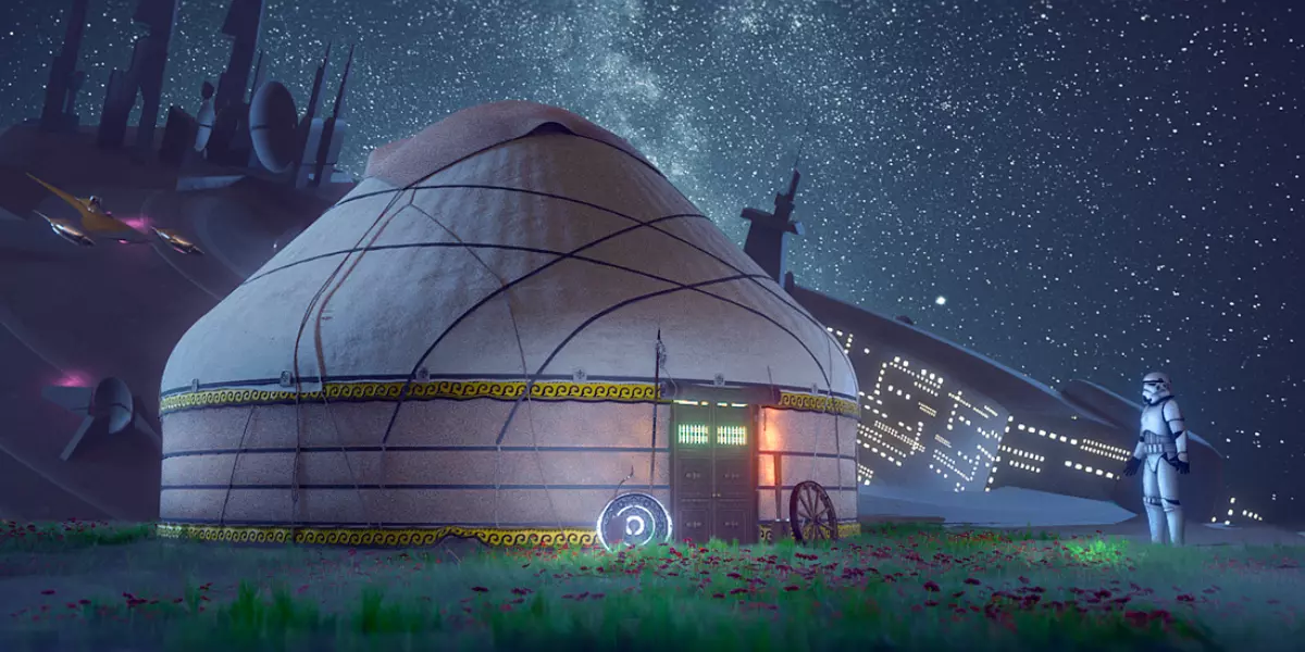 A traditional yurt (from the Turkic languages) or ger (Mongolian) is a portable, round tent covered with skins or felt and used as a dwelling by several distinct nomadic groups in the steppes of Central Asia. The structure comprises an angled assembly or latticework of pieces of wood or bamboo for walls, a door frame, ribs (poles, rafters), and a wheel (crown, compression ring) possibly steam-bent. The roof structure is often self-supporting, but large yurts may have interior posts supporting the crown. @en.wikipedia.org