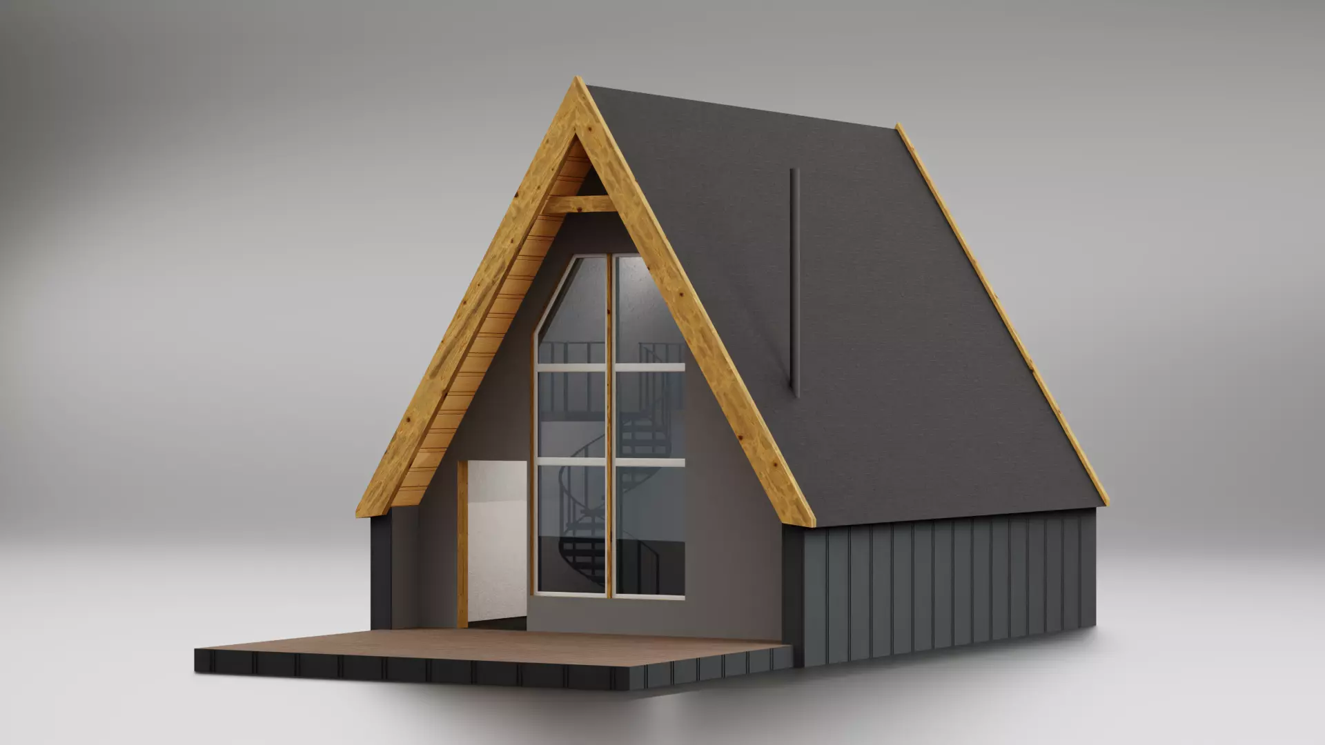 Modern A-Frame House 3D Model with complete exterior and interior finishing, front and rear terraces, spiral staircase, fireplace, and panoramic windows.The package includes a ready-to-use Twinmotion scene, where the house is placed in a forest environment with furniture and accessories.