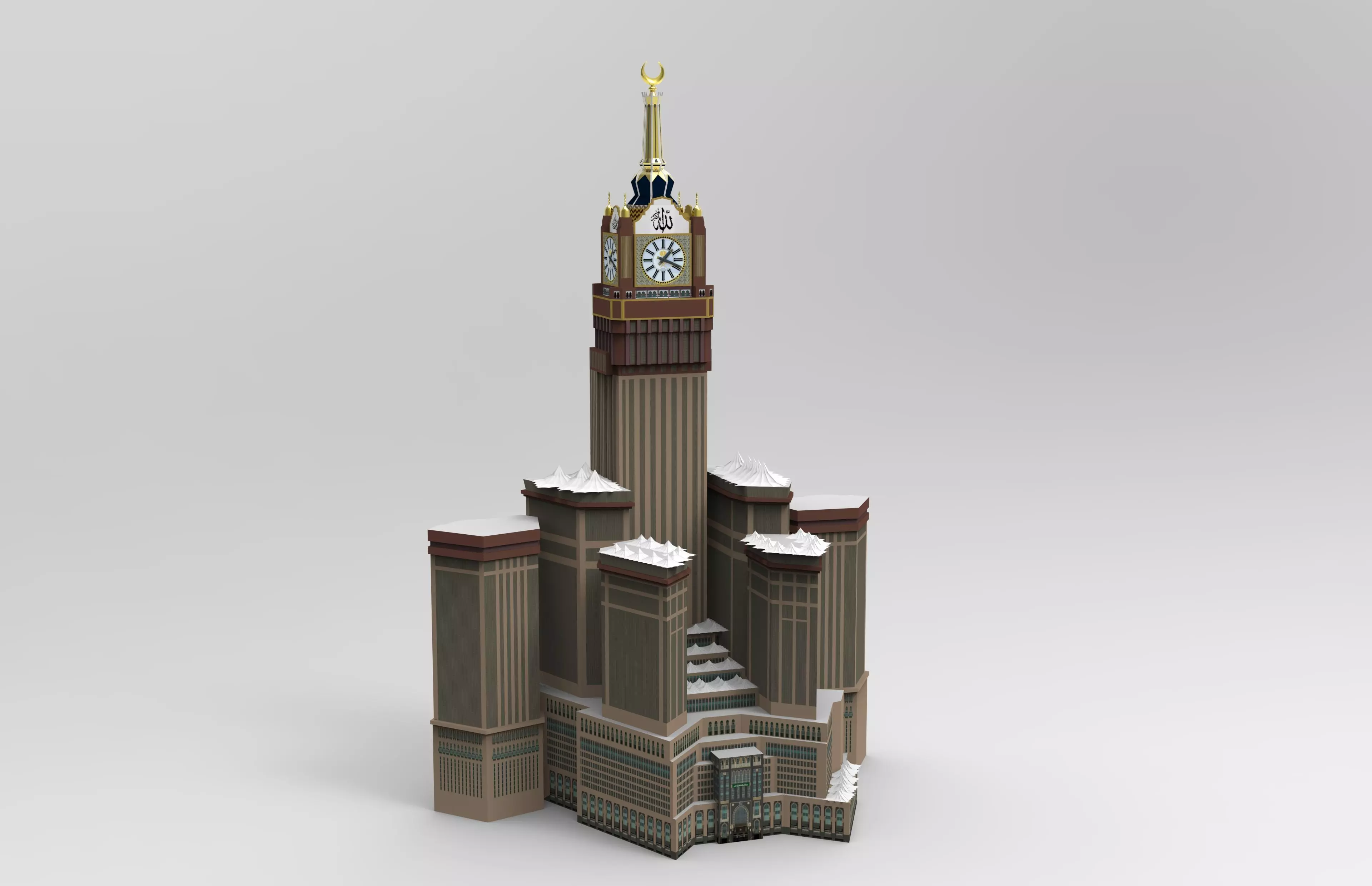 This 3D model represents the iconic Abraj Al Bait Towers in Makkah, accurately recreated with clean geometry and optimized low-poly topology.The model is fully textured with baked materials, making it ideal for real-time rendering, visualization, presentations, and architectural scenes.
