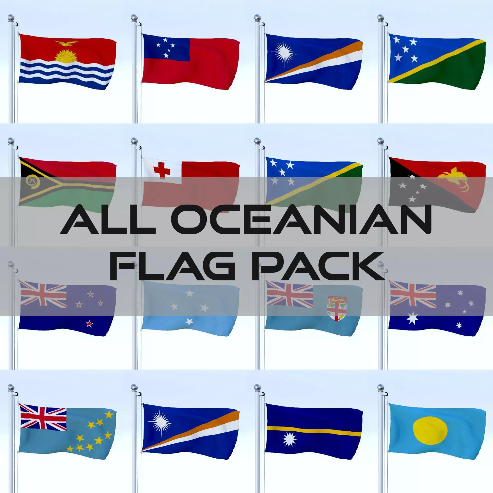 A model pack containing the flags of all Oceanian countries (14 flags). The models come in five formats:-.blend, rendered with cycles, as seen in the images, animated;-.obj, with materials applied;-.dae, with materials applied;-.stl, 3D print ready;-.fbx;The model pack contains an archive with separate folders for each country's flag, in which there are separate archives with each of the five different file formats for maximum convenience.Flags included (14): Australia; Federated States of Micronesia; Fiji; Kiribati; Marshall Islands; Nauru; New Zealand; Palau; Papua New Guinea; Samoa; Solomon Islands; Tonga; Tuvalu; Vanuatu.The 3d models were originally created in Blender 2.78 and rendered with Cycles.The models have materials applied in all formats, and are ready to import and render.For any problems please feel free to contact me.Don't forget to rate and enjoy!
