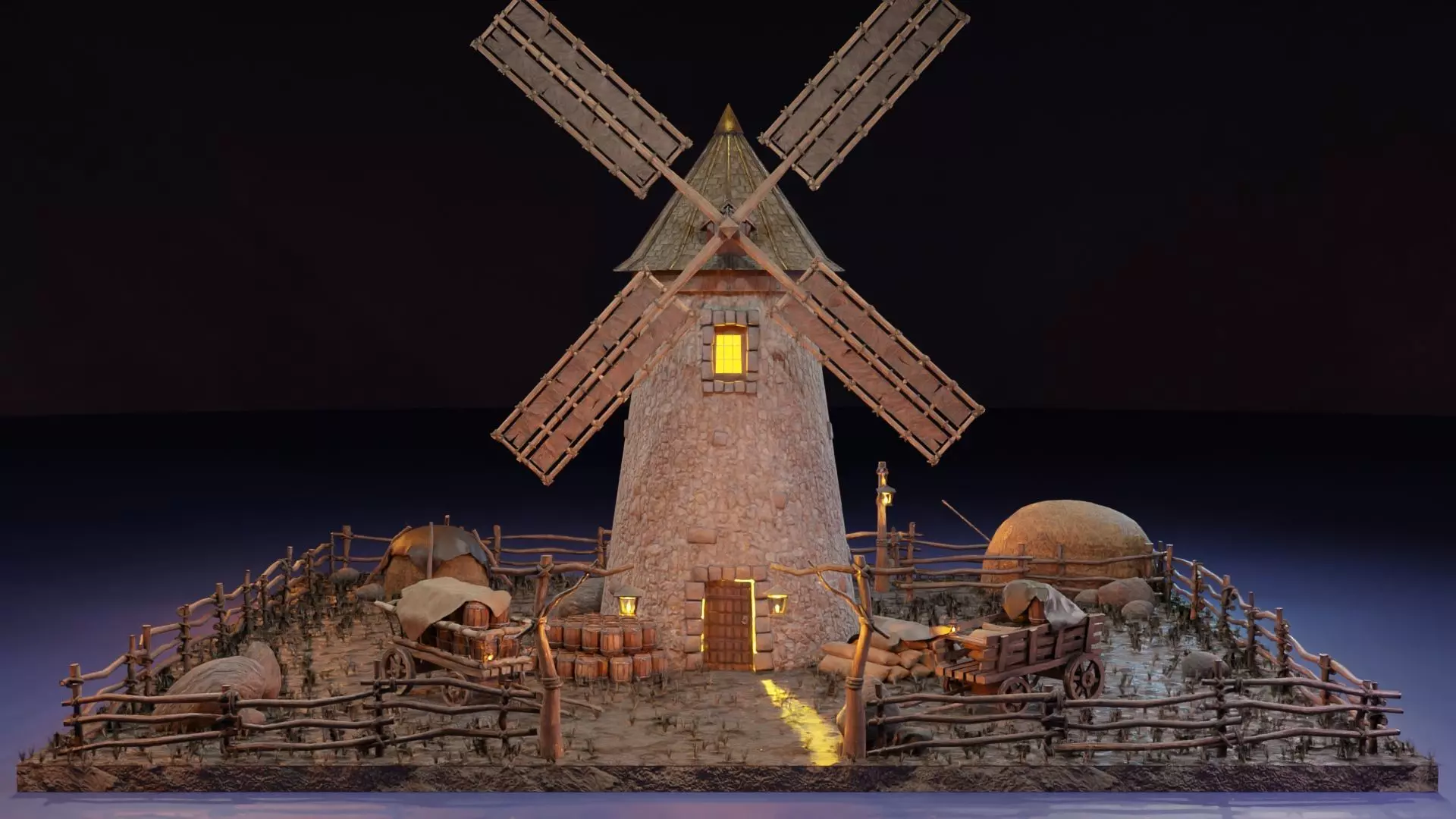 Low poly animated scene of a medieval mill with props. 3D sets are ready for use in game engines, sets can also be used in architectural rendering and various other purposes and scenes.