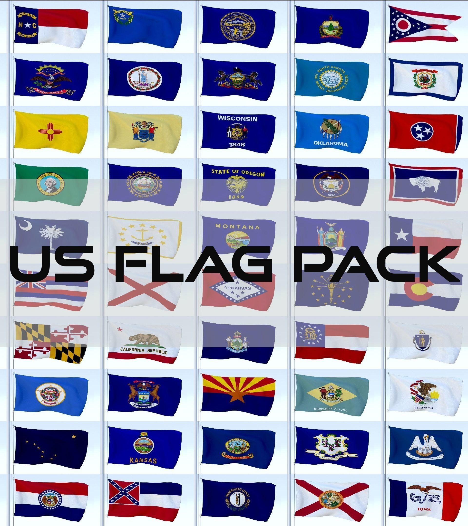 A model pack containing the flags of all 50 US States' flags.File formats:-.blend, rendered with cycles, as seen in the images;-.obj, with materials applied and textures;-.dae, with materials applied and textures;-.fbx, with material slots applied;-.stl;