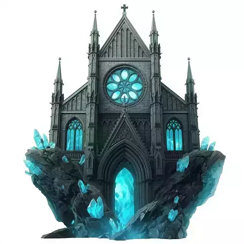 Fractured Bedrock Base The cathedral rests on a split rock formation. Massive jagged stones jut out diagonally from the base, framing the entrance like a cradle. Embedded in these rocks are raw blue crystals, implying the land itself is charged with magic.