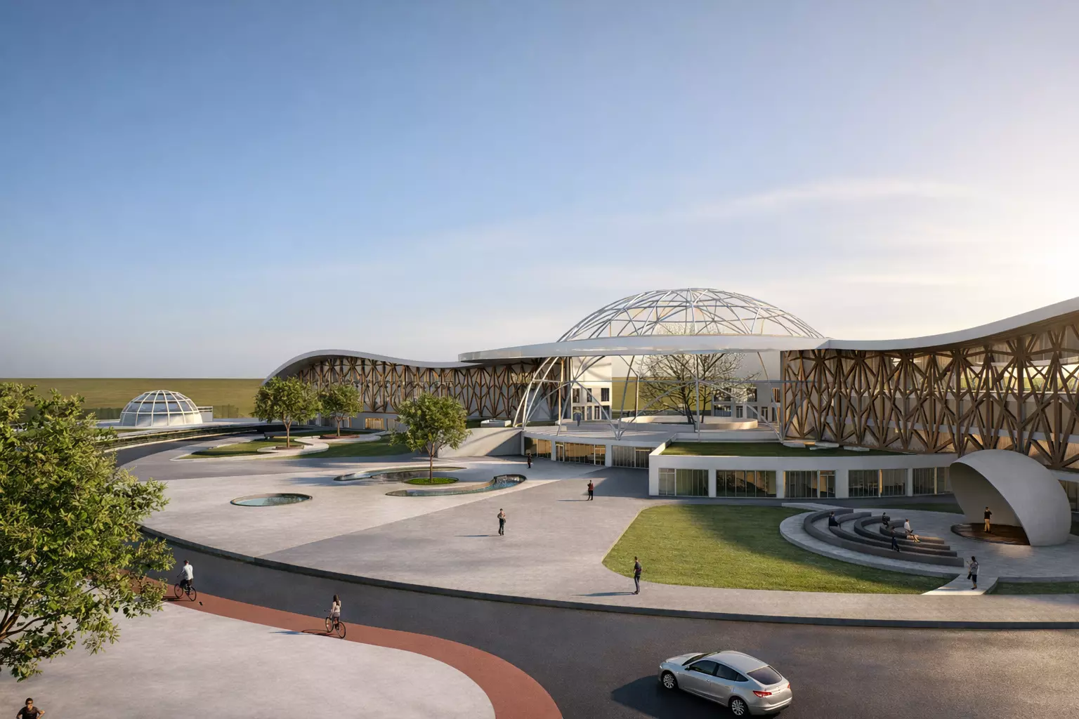 - Lenguaje arquitectónico contemporáneo con elementos orgánicos y estructuras ligeras.
