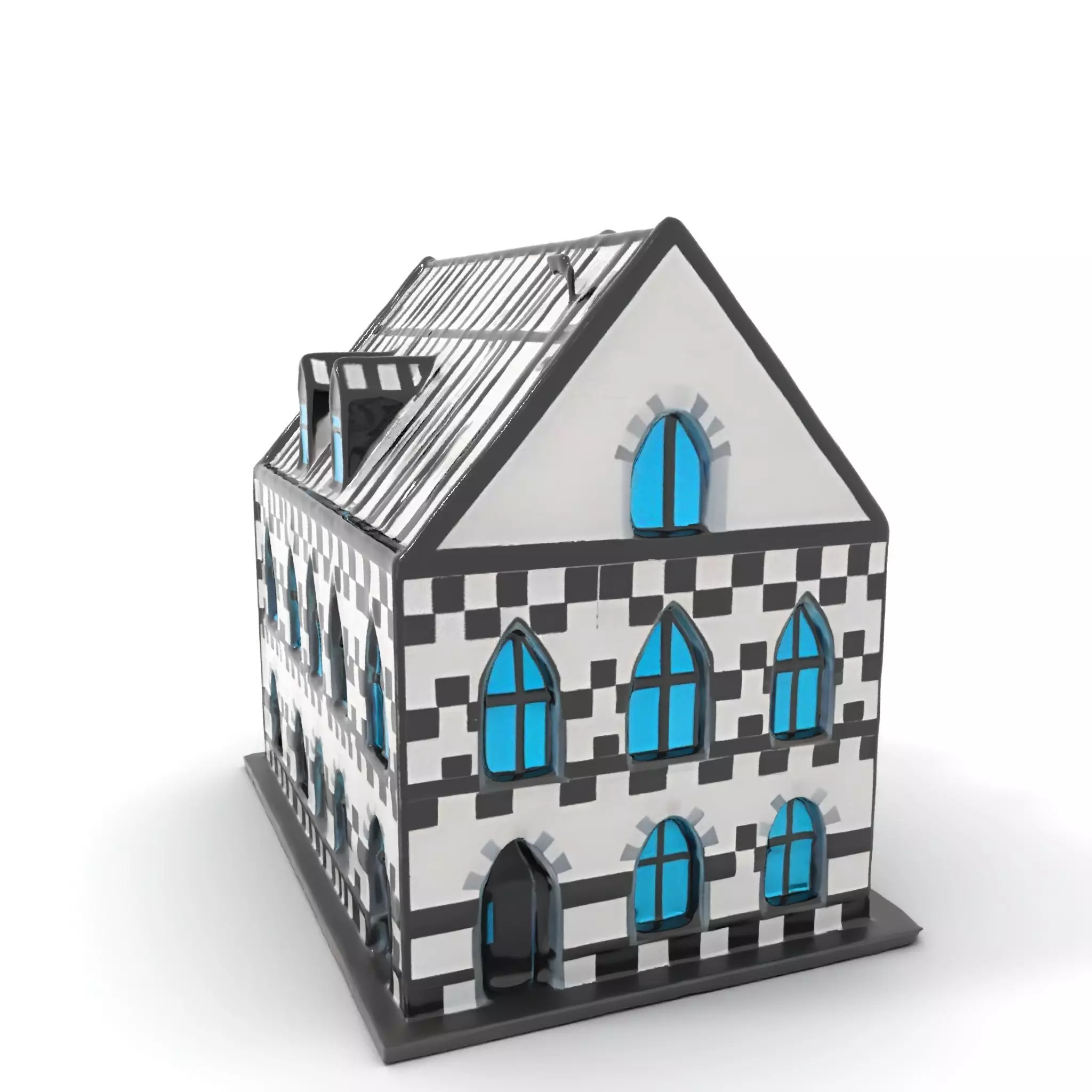 This Gothic-style building model features a distinct checkerboard facade with vibrant blue windows. Perfect for architectural visualizations and historical game environments, this model includes intricate details that bring a unique character to your projects. Each model has 3 levels of detail: low-poly (1000 triangles for mobile), middle-poly (10,000 triangles for environment), and high-poly (100,000 triangles), which allows for the use of this model in production rendering (such as 3ds max, Maya, Cinema4d, Blender, Vray/Corona/Cycles and all other), game engines (Unity and Unreal compatible), and interactive presentations, providing a choice of detail based on the LOD System principle. The model's textures are PBR, Diffuse, NormalMap, and reflection/roughness/metallic, which are suitable for any modern rendering engine. All models are accurately unwrapped and have no overlapping UV. All textures are 4096*4096 in size. If you enjoyed this model, please like and leave a comment!