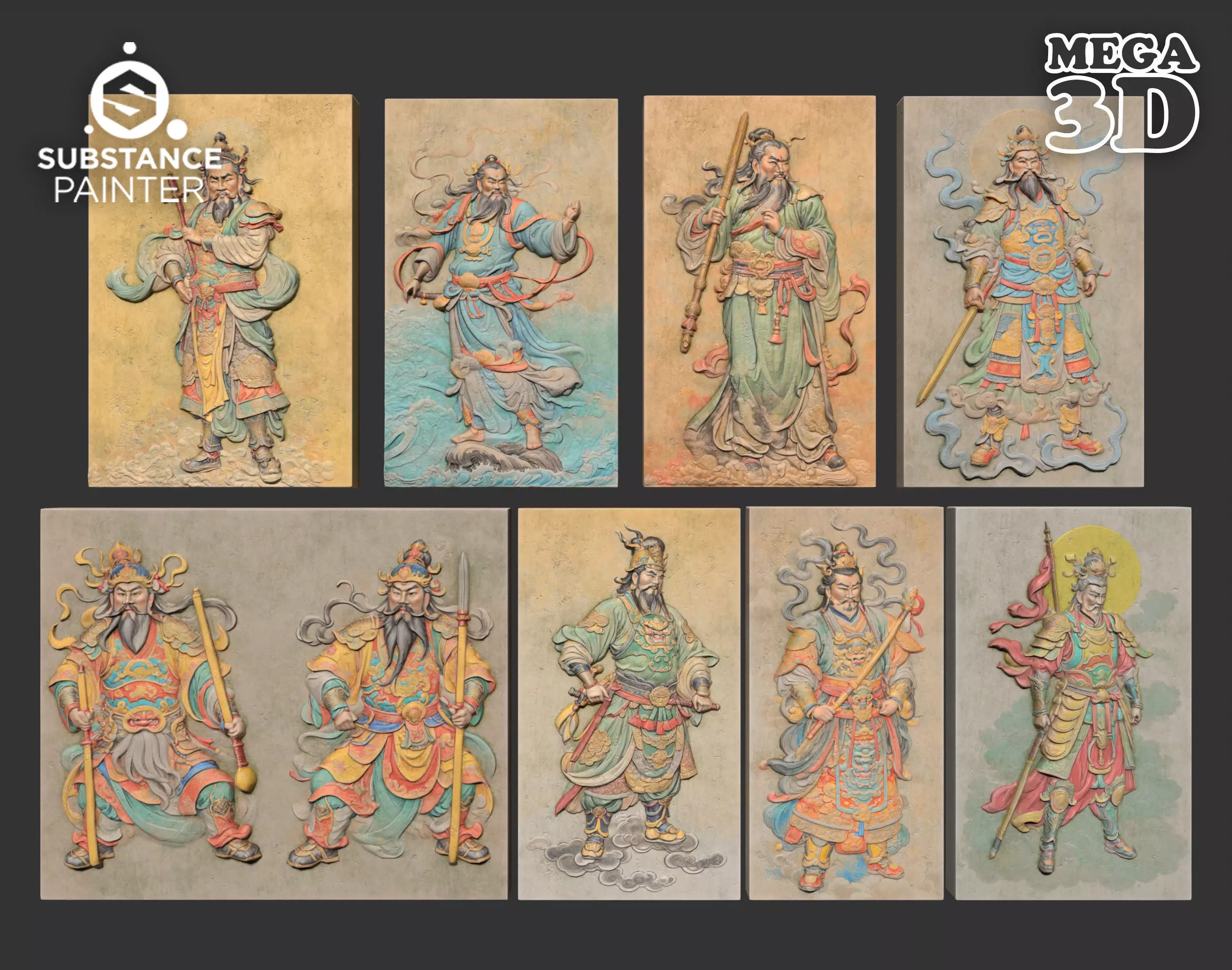 Chinese Temple Walls - Mural Bas relief Colored - 230909 Low-poly 3D model