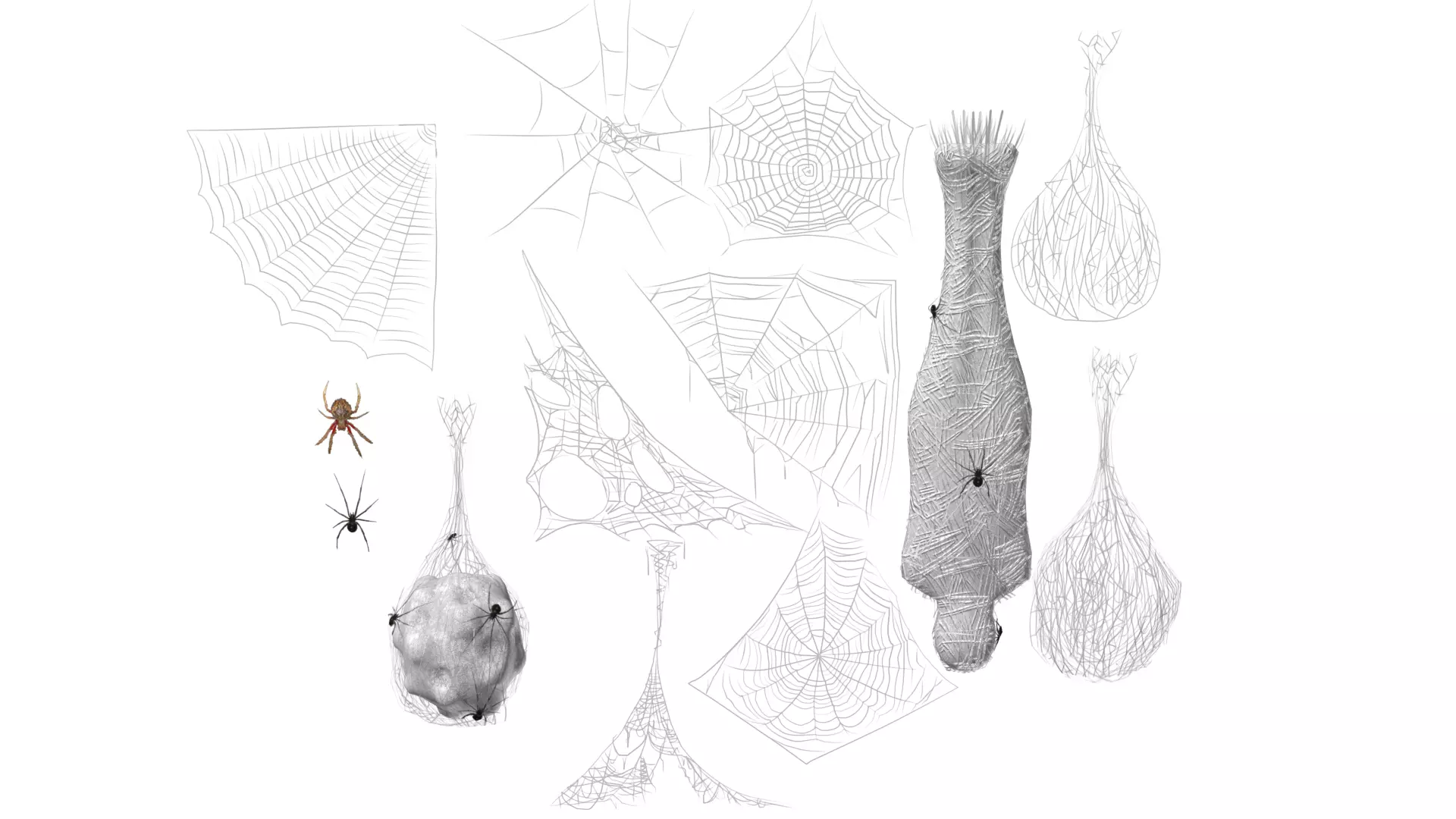 Low poly cobweb collection. There are eight webs, two cocoons and two spiders. Webs are created using alphas (transparency maps), and they are around sixteen polygons per web. Whole collection has 3860 polygons