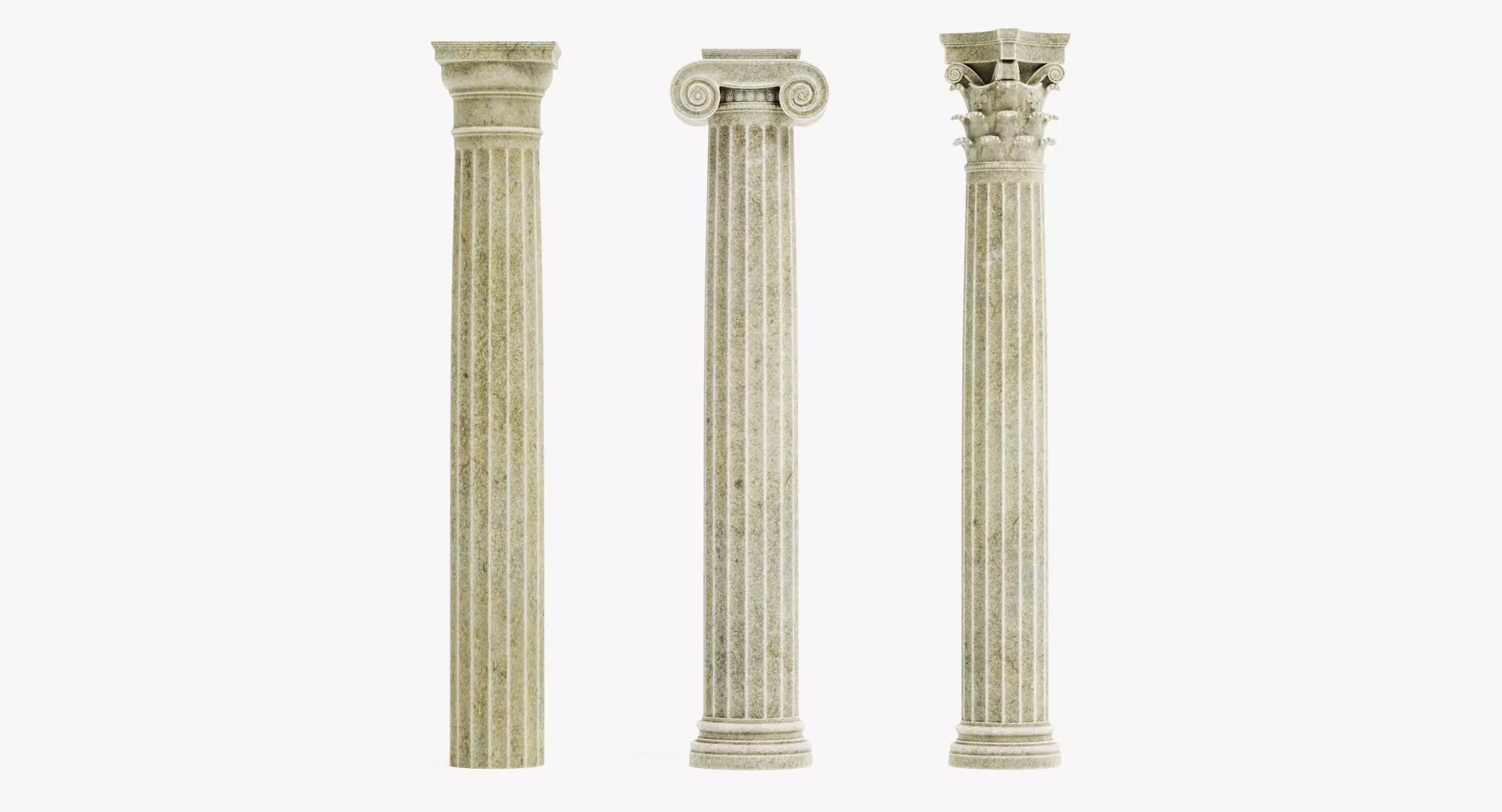 A collection of three aged classical columns (Doric, Ionic, and Corinthian) featuring stone-like textures and surface wear. Each column is modeled as an individual architectural element, designed to work together or independently within a scene. This set provides a versatile foundation for classical architecture, visualization projects, and historical environments.