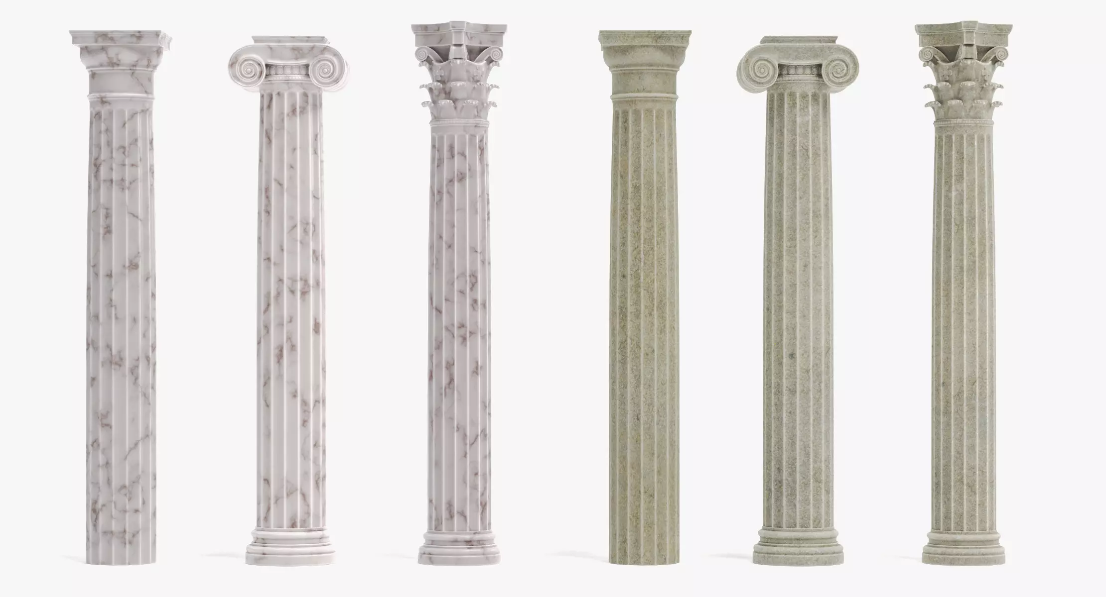 A complete collection containing all six column variants: Doric, Ionic, and Corinthian in both clean and aged versions. Each column is modeled as an individual architectural element, designed to work together or independently within a scene. This set offers maximum flexibility for building classical architecture across different time periods and visual styles. Designed for efficient scene building, visualization, and historical environments.