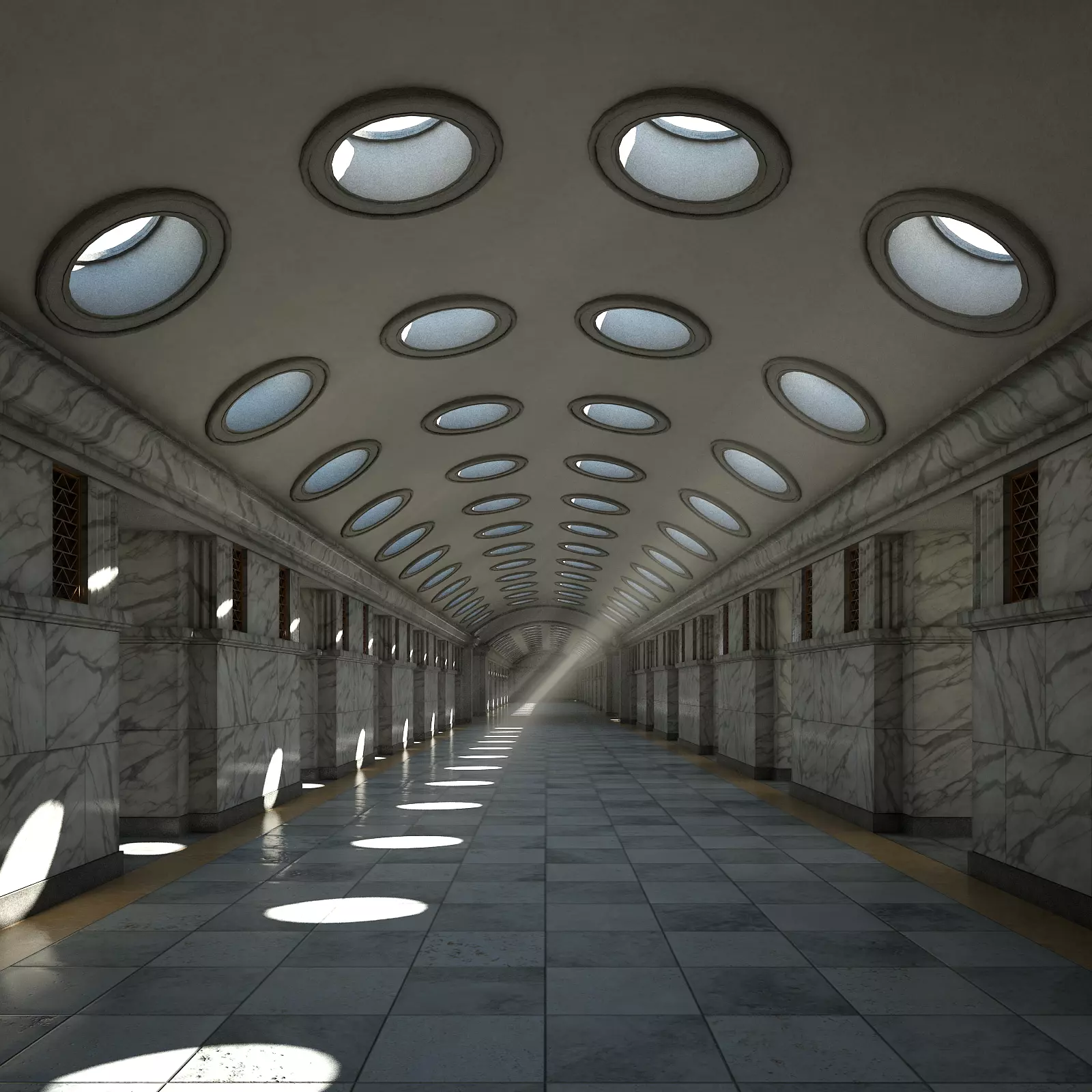 Detailed 3D model of a corridor / hallway. This model is composed of separate pieces: walls, window frames, door mouldings, pilars, etc...Suitable for high resolution close-up. Real world scale.