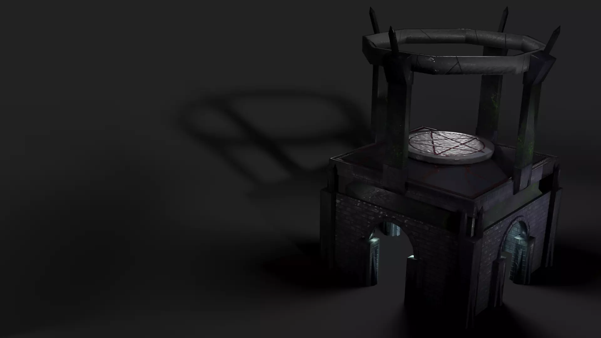 This necromancer's crypt and sacrificial altar is a rebuild of one of my earlier pieces, which I was unhappy with due to poor sculpting, texturing and lighting. Due to the complexity of the original I rebuilt all the individual elements separately, cleanly sculpted custom high-polys within 3ds Max before reassembling. I then edited the UV's accordingly in Photoshop and re-mapped them to the geometry. Additional sculpting in Mudbox was used to carve the pentagram into the altar.