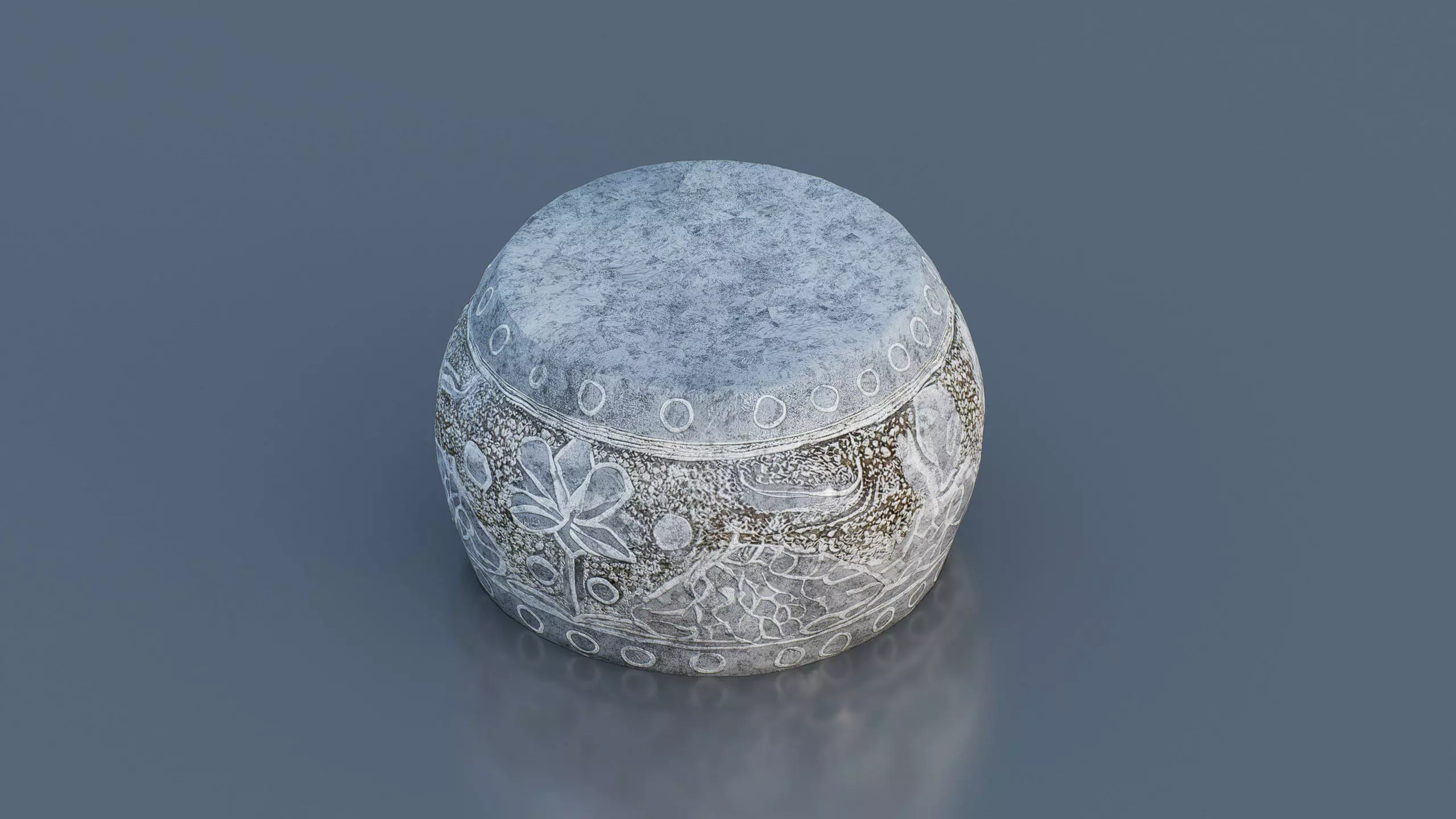 This 3D low-poly model represents a intricately designed cylindrical base, likely inspired by classical architectural elements such as a column plinth. Crafted with a minimalist polygon structure, the model features detailed carvings of floral and geometric patterns, giving it an ornate yet timeless aesthetic. The weathered texture and subtle color palette enhance its historical charm, making it ideal for use in architectural visualizations, historical reconstructions, or game environments that require a touch of elegance with low computational demands.