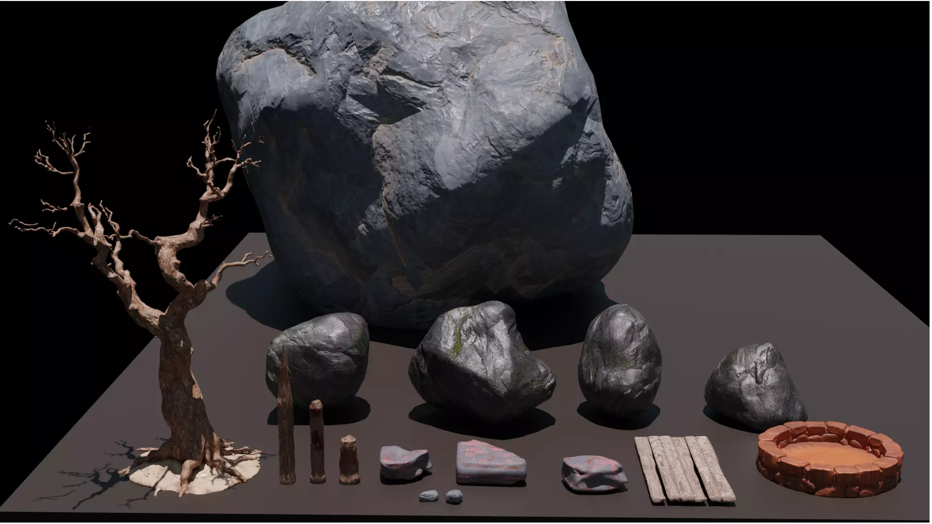 The models are optimized for real-time use and work well in engines such as Unity and Unreal Engine, as well as for offline rendering in Blender. No terrain, grass, soil, or background elements are included — only the listed props.