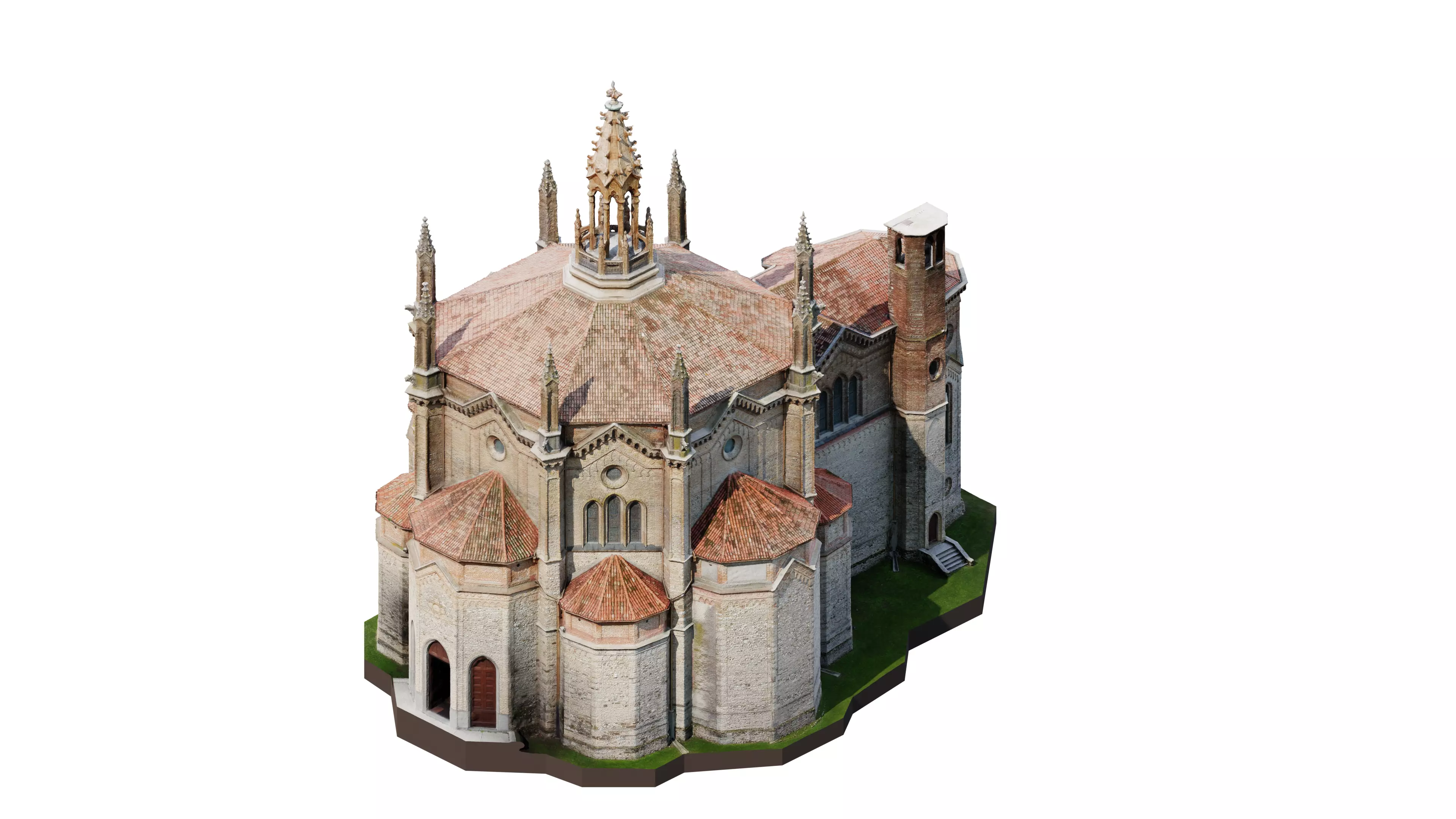 Le quattro facciate minori ospitano nella parte superiore trifore vetrate. Dei quattro lati maggiori, i due sull’asse principale sviluppano il prospetto di facciata e il presbiterio; dagli altri due lati aggettano le due cappelle maggiori.
