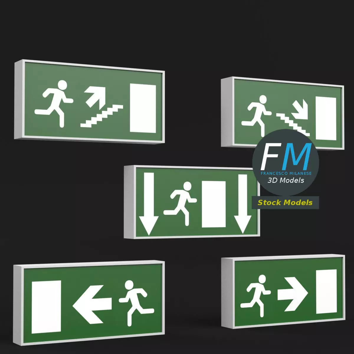 Emergency exit signs 3D Model. 10 individual objects (5 cases, 5 panels), sharing 2 non overlapping UV Layout maps, Materials (cases, signs; so, you can easily turn them in emitting panels) and PBR Textures sets. Production-ready 3D Model, with PBR materials, textures, non overlapping UV Layout map provided in the package.Quads only geometries (no tris/ngons).Easily customizable: UV unwrapped geometries, so you can create new Textures (or modify the existing ones) using the UV Layout maps provided in the package (as png with alpha).Each Object, Material or Texture provided in the package has a unique, meaningful name.Made in Blender 3.1 with a Cycles PBR shader with textures included (principled and Eevee compatible), then exported to OBJ and FBX; materials and textures made in Substance Painter, exported for PBR, V-Ray, Unity, Unreal.PROMO IMAGES: the first image has been rendered in Cycles for Blender; in particular, you can find 11+ promo images in this description:
