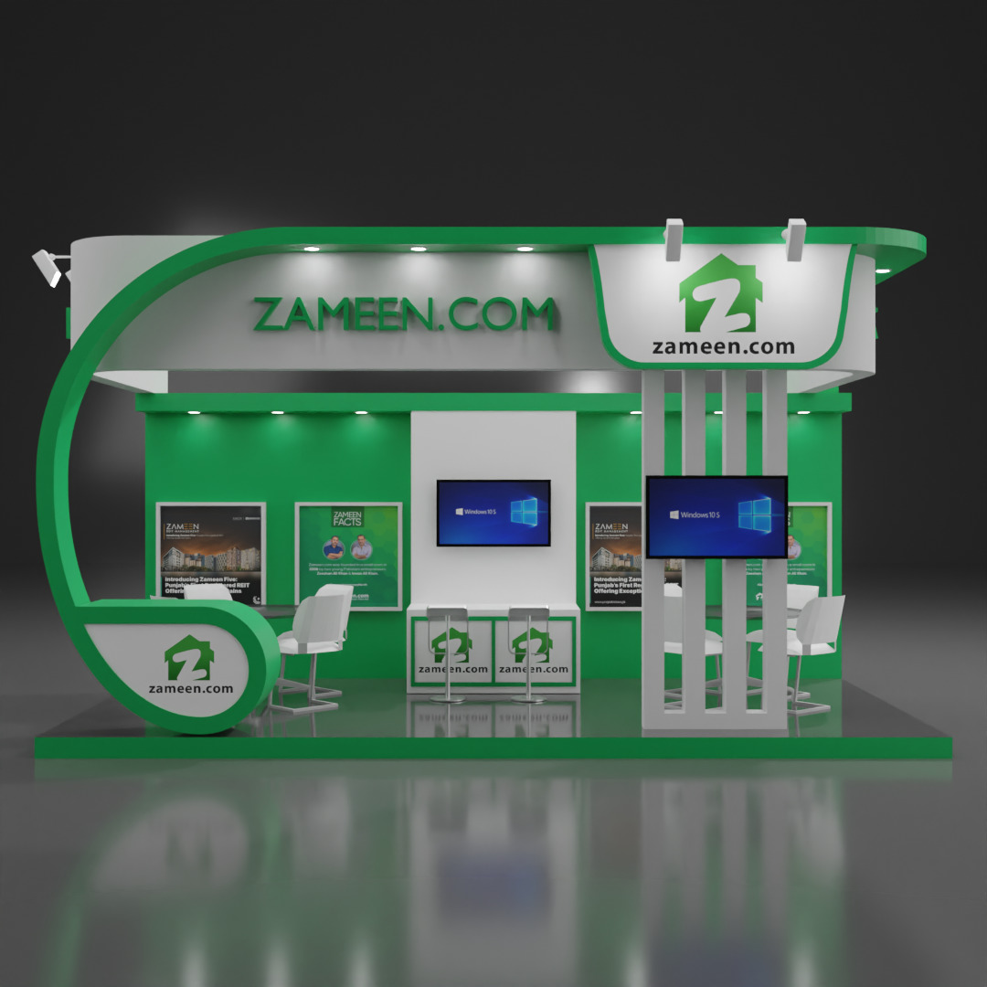 This sleek and contemporary Exhibition Booth 3D Model is designed with clean lines, a bold green-white color theme, and professional layout – inspired by real-world trade show booths like Zameen.com. Perfect for businesses and clients in real estate, tech, marketing, or corporate sectors, this booth model enhances any virtual event, product showcase, or architectural visualization.