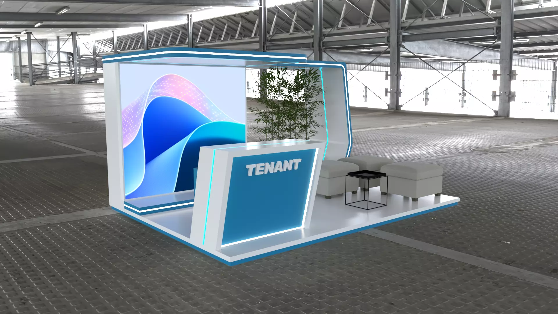 A modern and minimalist 4x3 meter exhibition booth, perfect for trade shows, marketing events, and product showcases. This 3D model features clean lines, a built-in display screen area, and a sleek modular design. Optimized for high-quality renders, VR/AR projects, and event visualization. Includes ready-to-use formats for easy customization.