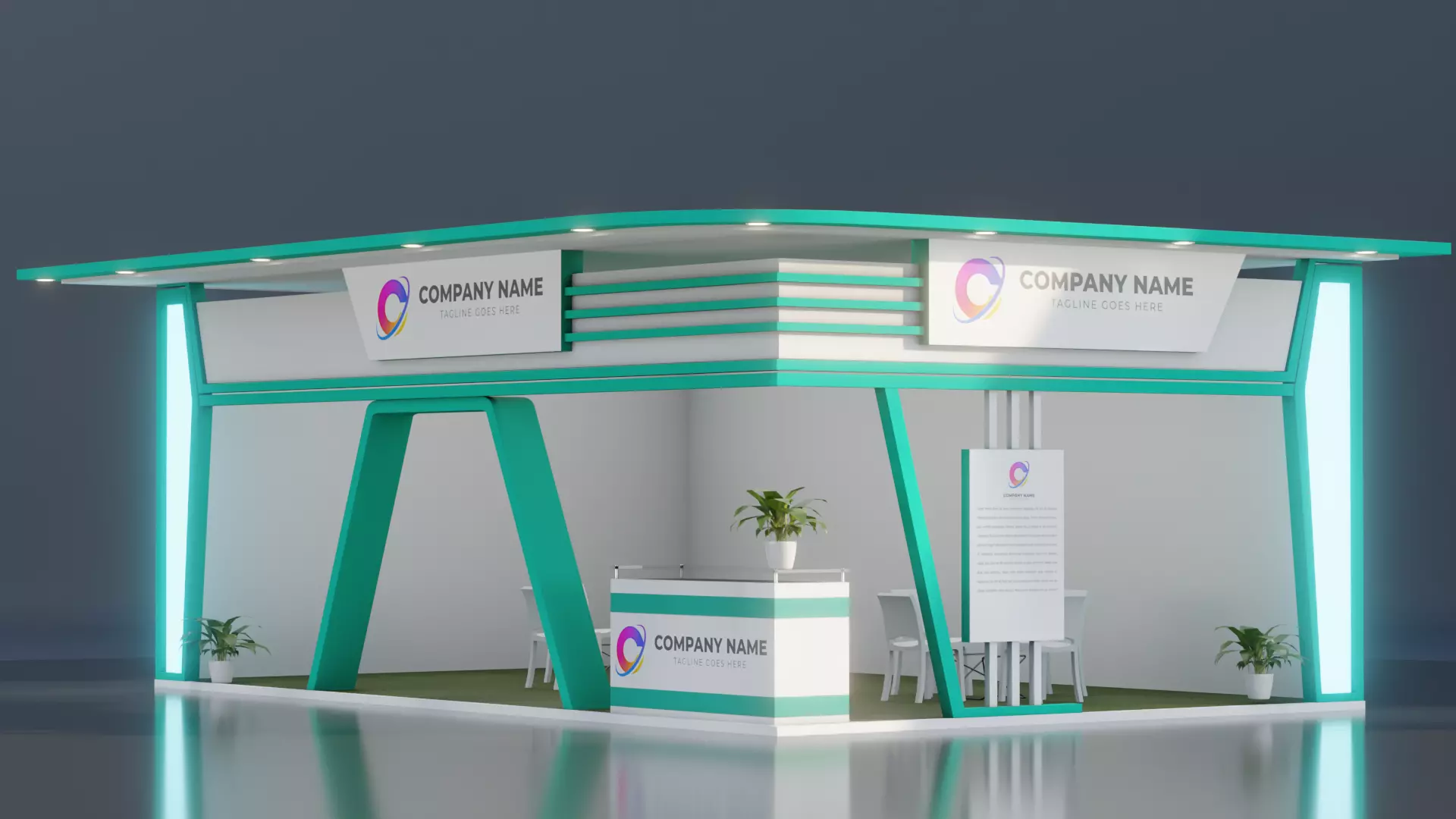 There are three types of exhibition display stands included in this model. These are low poly models that can be used in VR and mobile devices. There is a baked texture with all PBR maps on the model. The model also includes a chair, a stand, a table, and props 3d models.