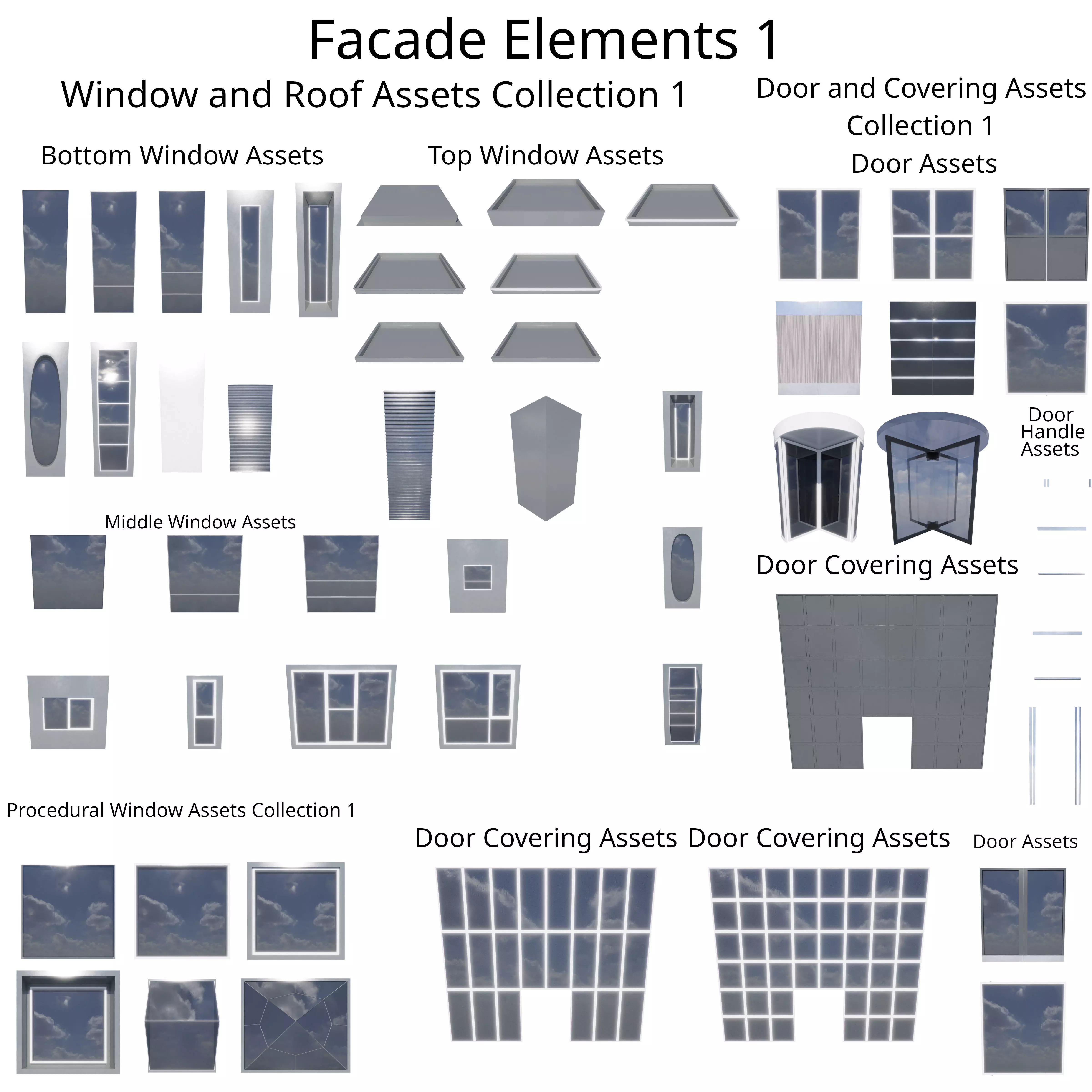 A parametric building asset collection made in blender. All the assets in this collection can be modified using geometry nodes parameters, and can be used in different kinds of buildings. This includes 3 asset collections.If you buy the asset collections individually from my profile, you pay $25 + $25 + $15 = $65.If you buy this level 2 asset collection, you pay $35 , so a discount of $30Collection 1 is window & roof assets 1, which include bottom, middle and top window & roof assets.Using the geometry nodes parameters, you can easily increase or decrease width, height, positions etc of the various elements of the asset. Each asset has its own unique parameters.Collection 2 is door & covering assets 1, which include door, door covering and door handle assets.Using the geometry nodes parameters, you can easily increase or decrease width, height, positions etc of the various elements of the assets. Each asset has its own unique parameters.Collection 3 is Procedural Window Assets 1, which include windows, with various parameters to modfy them procedurally, like width, height, no. of segments horizontally, vertically etc.Using the geometry nodes parameters, you can easily increase or decrease width, height, positions etc of the various elements of the assets. Each asset has its own unique parameters.