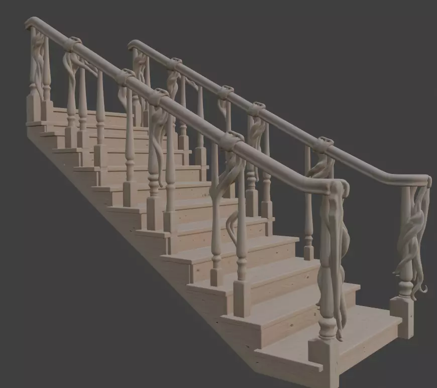 Highly detailed, production-ready 3d model of a magical fantasy staircase featuring natural wooden treads and handrails entwined with sculpted organic vine-like balusters and twisted root details. Perfect for fantasy interiors, enchanted houses, game environments, cinematic scenes, and architectural visualization. Clean topology, fully unwrapped, 4K-ready for PBR texturing.