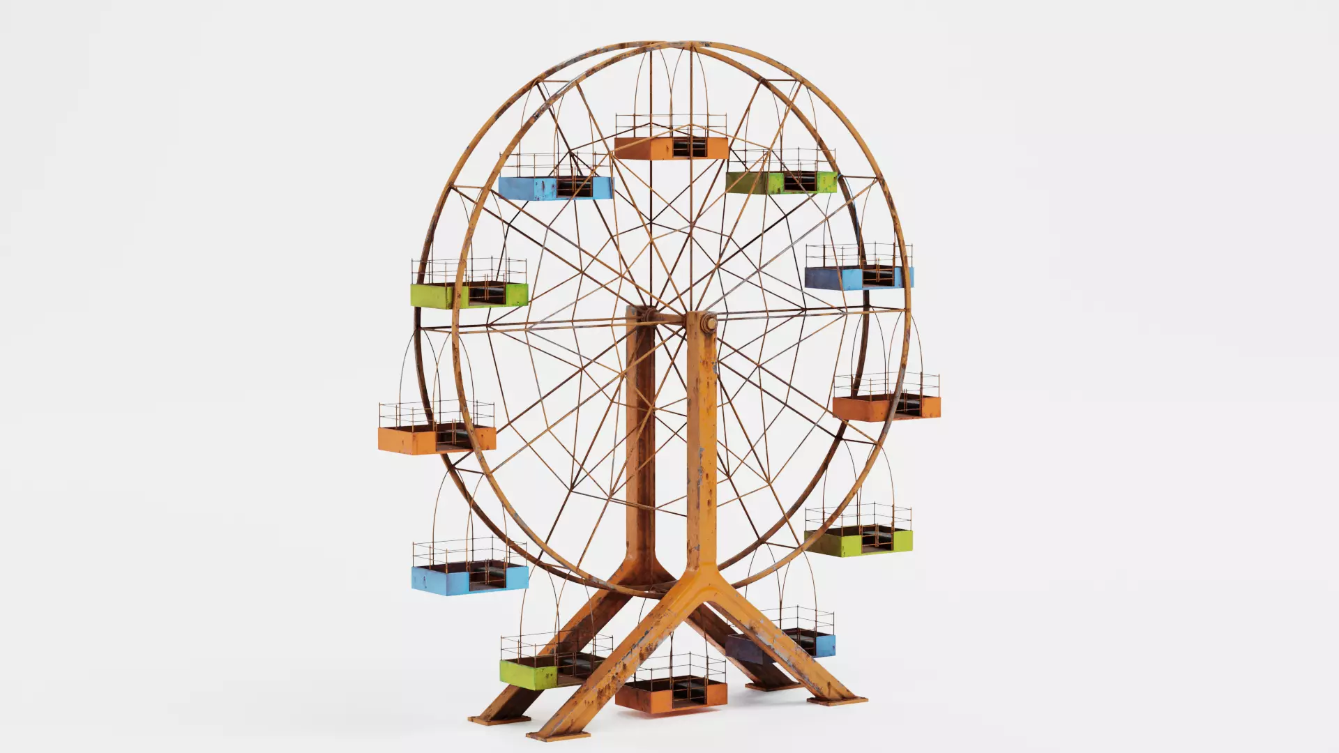 A realistic ferris wheel featuring an expressive, color-rich finish combined with visible surface wear. The painted metal frame shows natural signs of aging, with subtle rust and paint variation that bring a sense of history and use, while the multi-colored open cabins introduce visual rhythm. The rigged setup enables smooth rotation of the wheel and responsive cabin movement, making the asset well suited for dynamic scenes. Ideal for amusement parks, cinematic environments, and stylized or narrative-driven compositions.