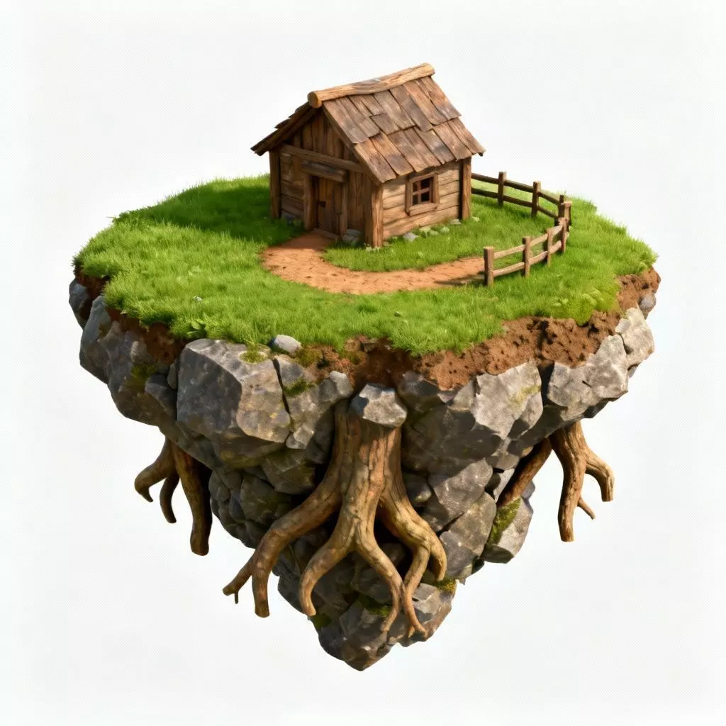 Floating Island Cottage 3D Model – Rustic Sky Home