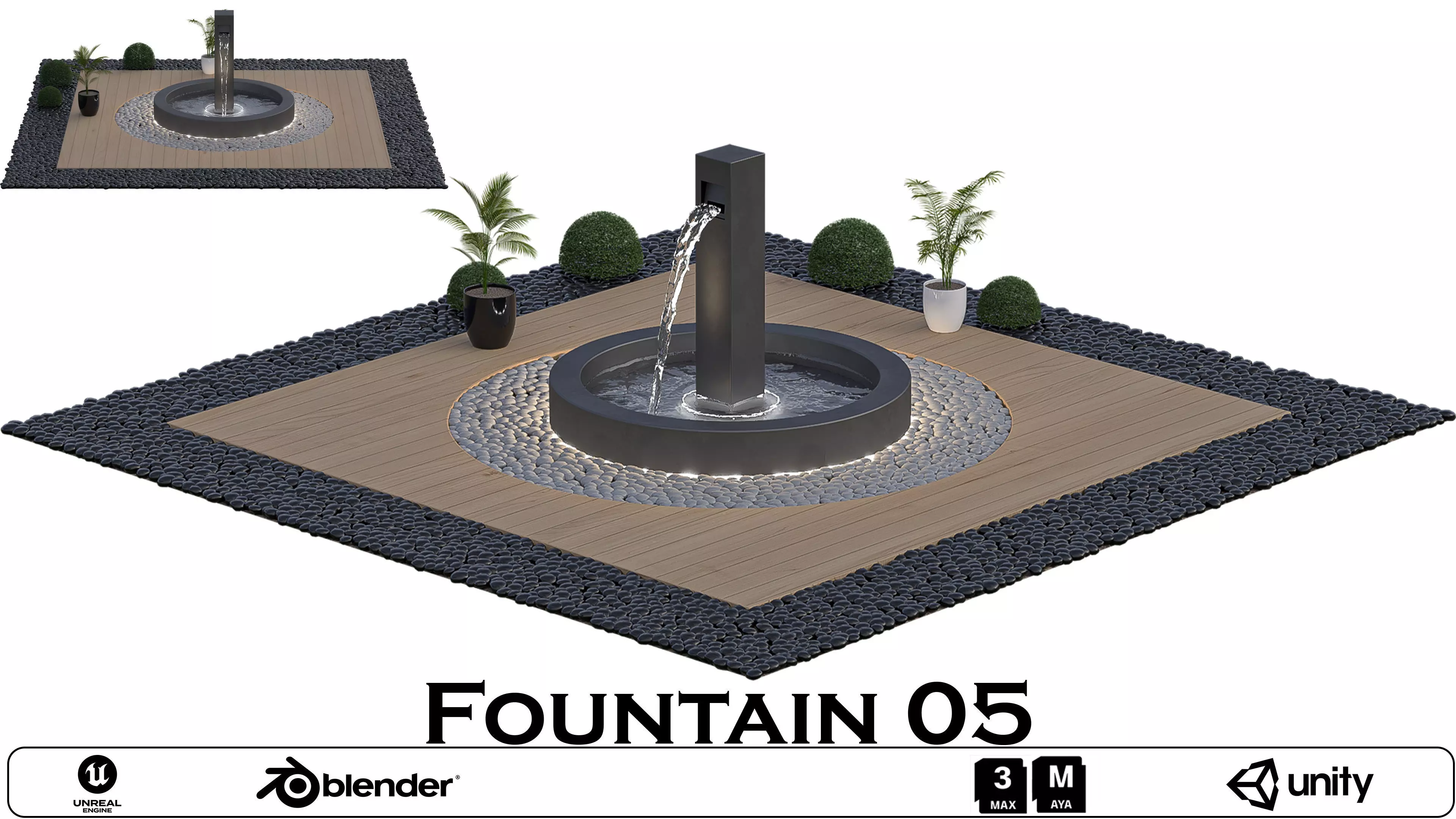 Modern Design: The fountain showcases a minimalist circular basin with a central water jet and a vertical water blade, surrounded by a pebble border and wooden decking.LED Lighting: Integrated LED lights around the base enhance the fountain's visual appeal, making it ideal for evening or nighttime scenes.High-Quality Detailing: Meticulously crafted to ensure realistic textures and refined details, from the water flow to the pebbles and wooden platform.Versatile Use: Perfect for virtual gardens, urban landscapes, architectural visualizations, or as a decorative centerpiece in 3D scenes.Optimized for Rendering: Compatible with Blender, Unreal Engine, Unity, and 3ds Max for seamless integration into your workflow.