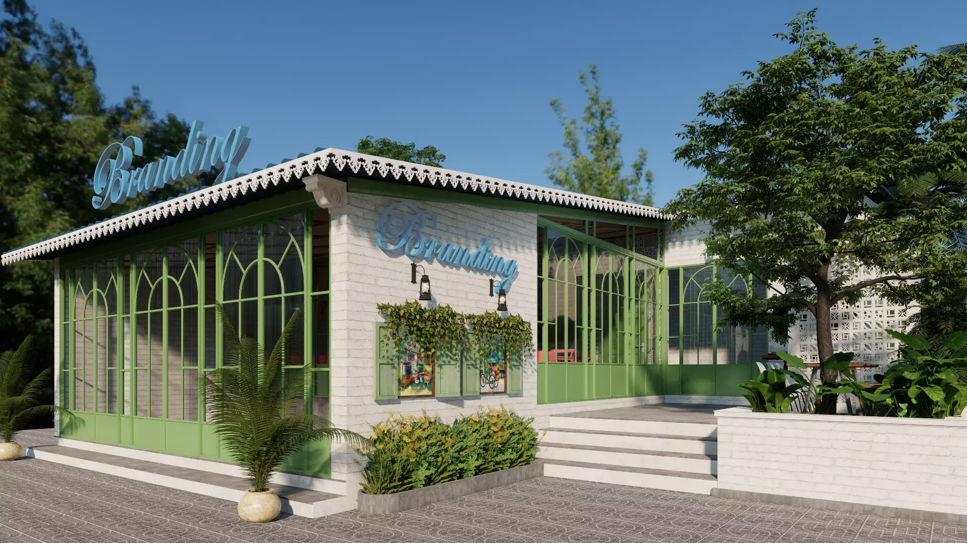 Detailed Facade: A beautifully crafted exterior with French-inspired elements, including vintage windows, ornate trims, and vibrant accents.