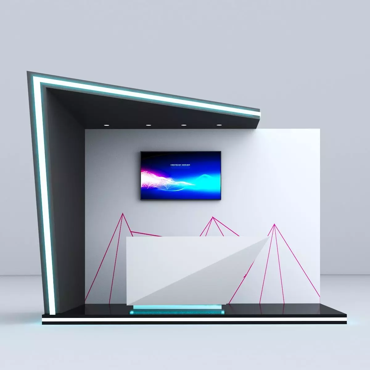 3d model of a futuristic booth, consisting of a back panel with a unique triangular pattern designed by us and a deconstructed counter. There is an attached version of the booth designed in way so that it can be repeated, and the wall panels can be placed side by side without being monotonous. The whole structure is an original design done from the preliminary sketches to the final renderings by us.