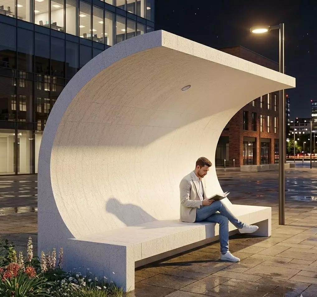 Redefine urban waiting areas with this Modern Concrete Bench Shelter. This architectural piece features a seamless, continuous C-shaped curve that transitions from a sturdy seating base into a protective overhead canopy.